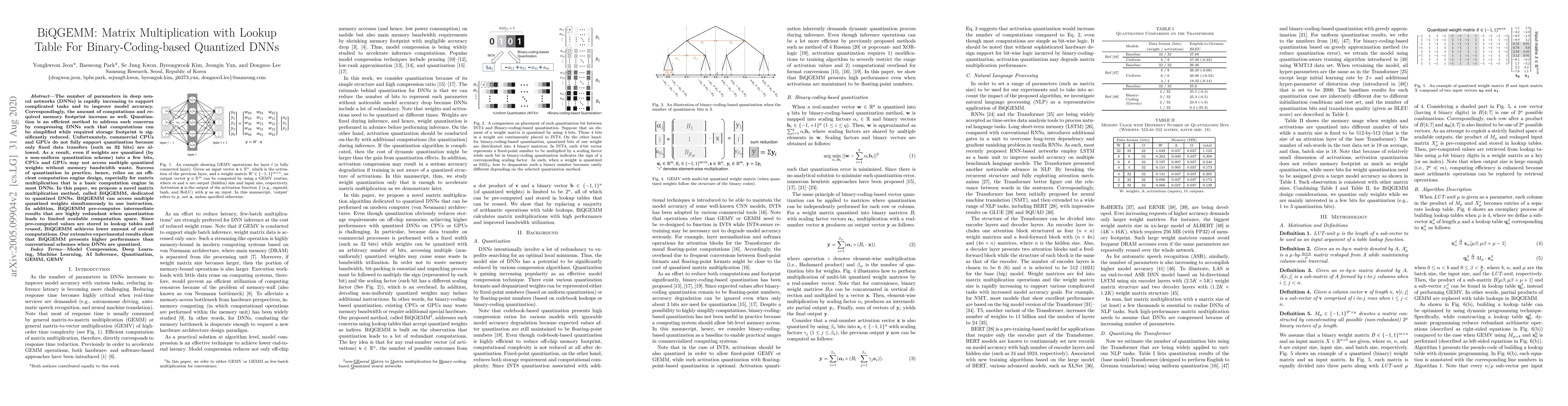 The paper proposes BiQGEMM, a novel matrix multiplication method for quantized DNNs that accesses multiple quantized weights simultaneously, reducing memory bandwidth waste. BiQGEMM pre-computes and reuses intermediate results via lookup tables, achieving lower overall computations and higher performance compared to conventional methods.