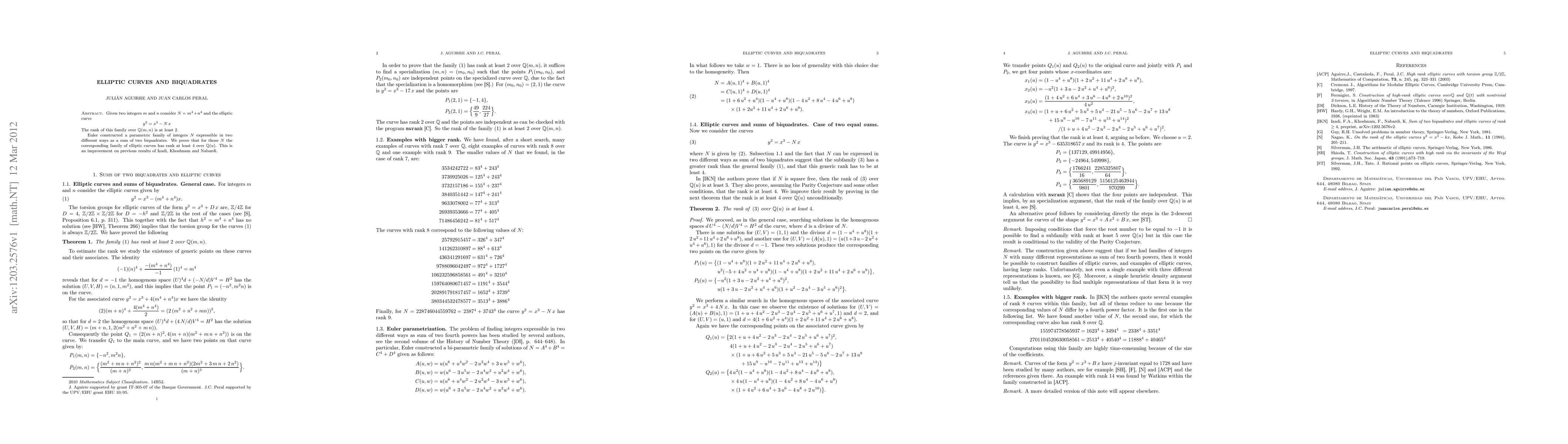 The paper proves rank properties of elliptic curves defined by y^2=x^3-Nx, where N is expressible as sums of two fourth powers. It utilizes homogenous spaces and specialization arguments.