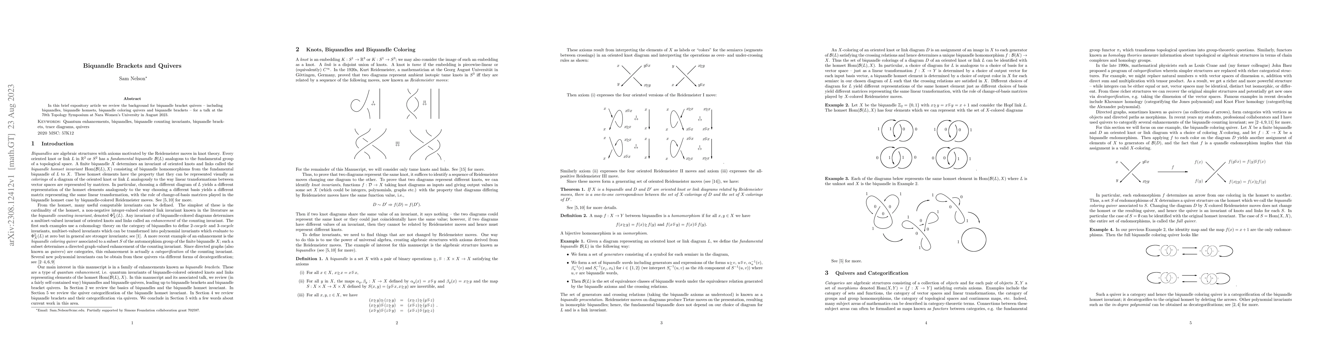 The paper provides an expository review of biquandle bracket quivers, covering biquandles, biquandle homsets, biquandle coloring quivers, and biquandle brackets, primarily for a presentation at the 70th Topology Symposium.