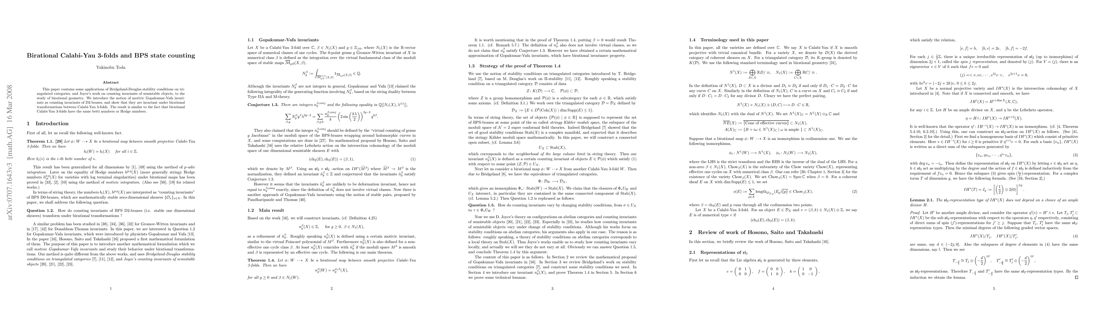 This paper applies Bridgeland-Douglas stability conditions and Joyce's counting invariants to birational geometry of Calabi-Yau 3-folds, introducing motivic Gopakumar-Vafa invariants as D2-brane counting invariants that remain invariant under birational transformations. This parallels the invariance of Betti and Hodge numbers in such transformations.