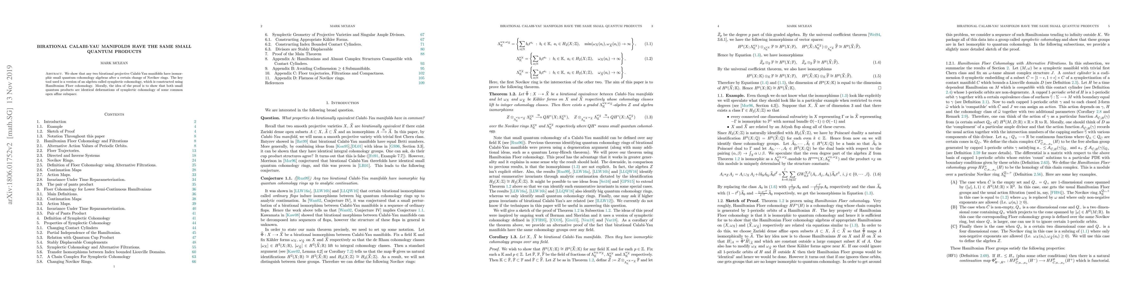 We show that any two birational projective Calabi-Yau manifolds have isomorphic small quantum cohomology algebras after a certain change of Novikov rings. The key tool used is a version of an algebra called symplectic cohomology, which is constructed using Hamiltonian Floer cohomology. Morally, the idea of the proof is to show that both small quantum products are identical deformations of symplectic cohomology of some common open affine subspace. Part of the proof uses the fact that subvarieties of positive codimension are stably displaceable.