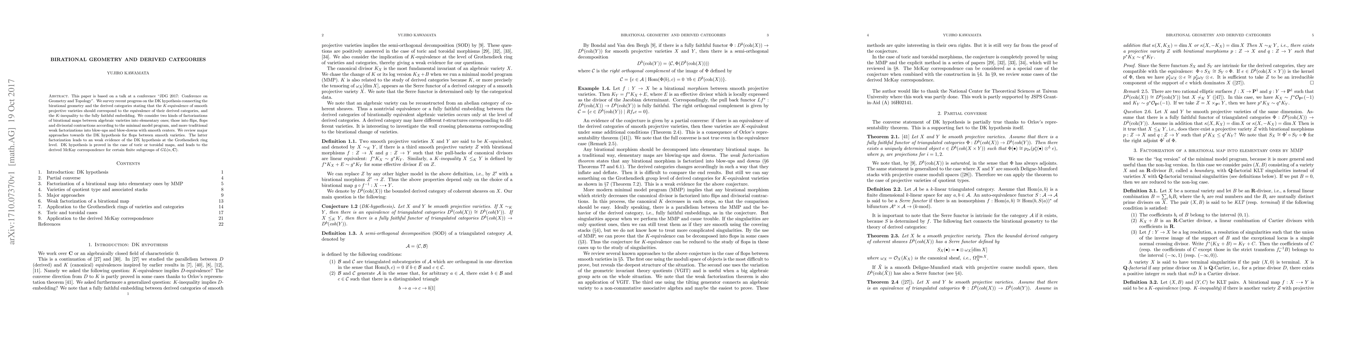 This paper is based on a talk at a conference "JDG 2017: Conference on Geometry and Topology". We survey recent progress on the DK hypothesis connecting the birational geometry and the derived categories stating that the K-equivalence of smooth projective varieties should correspond to the equivalence of their derived categories, and the K-inequality to the fully faithful embedding.