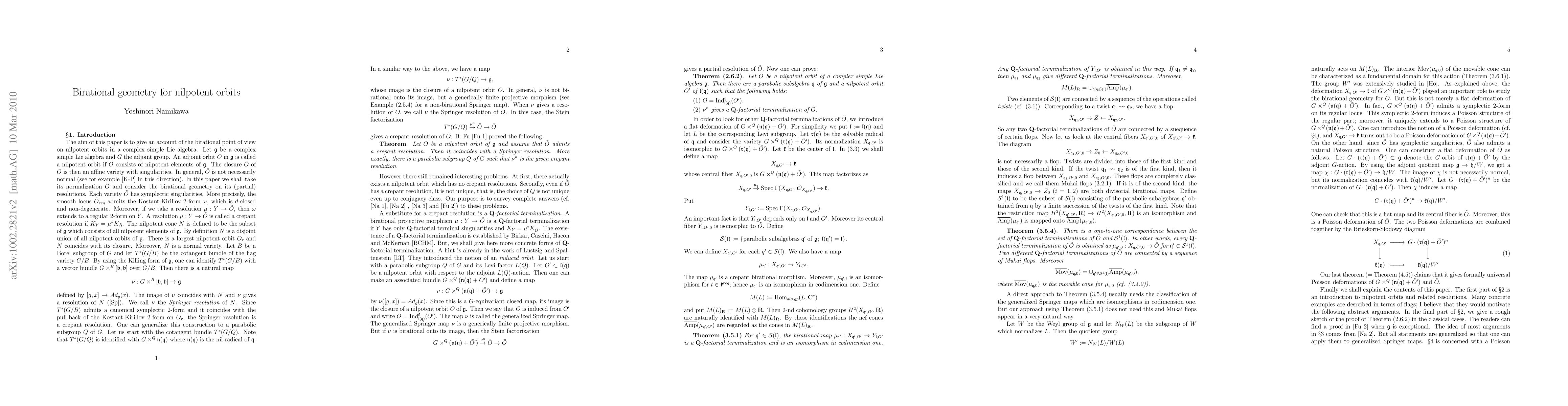This paper surveys birational geometry of nilpotent orbits, covering resolutions, terminalizations, and Poisson deformations. It focuses on the fundamental aspects and examples of nilpotent orbit resolutions and related birational transformations.