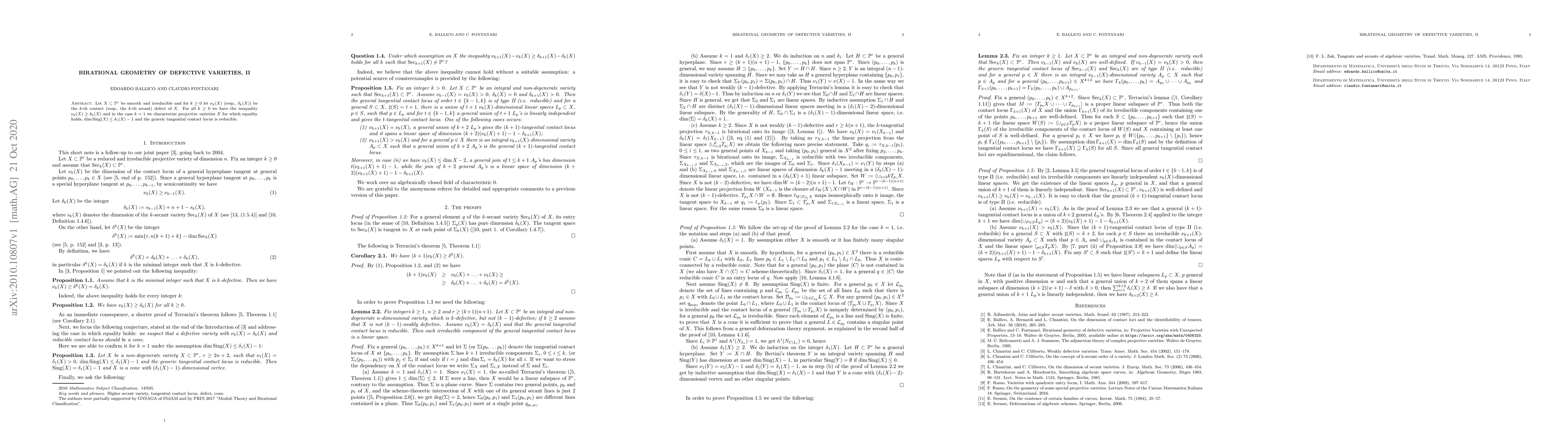 This paper explores the birational geometry of defective varieties, establishing that for smooth irreducible varieties X in projective space, the k-th contact defect (ν_k(X)) is always greater than or equal to the k-th secant defect (δ_k(X)). For k=1, it identifies specific projective varieties where equality holds, characterized by certain conditions on their singularities and tangential contact loci.