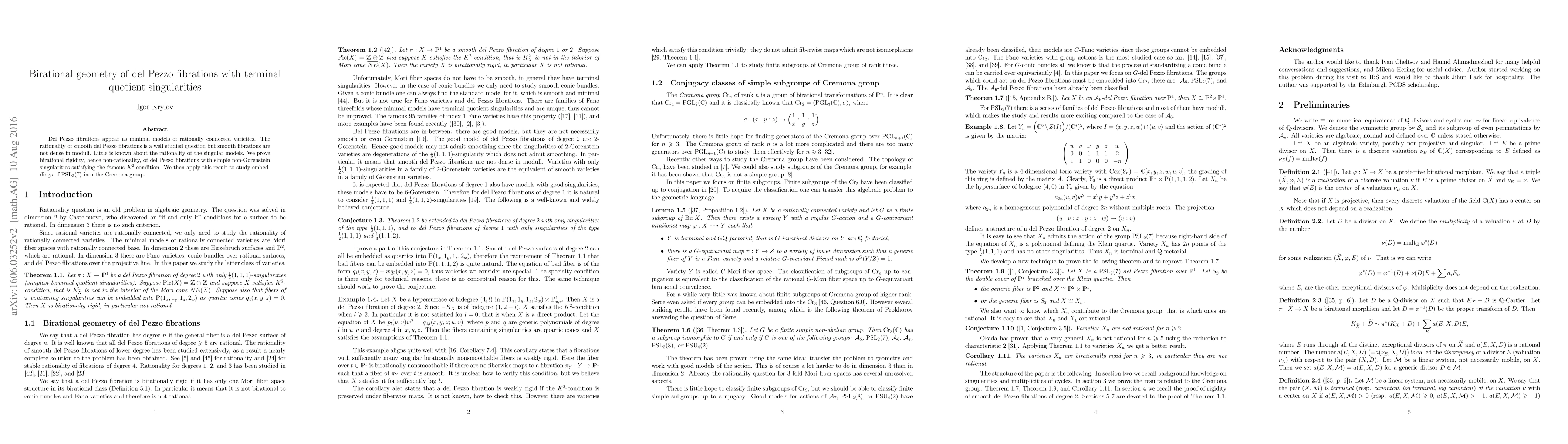 This paper proves birational rigidity and non-rationality of del Pezzo fibrations with specific singular quotients, and applies this to explore embeddings of $\operatorname{PSL}_2(7)$ in the Cremona group. The study focuses on singular models, which are less understood compared to smooth ones.