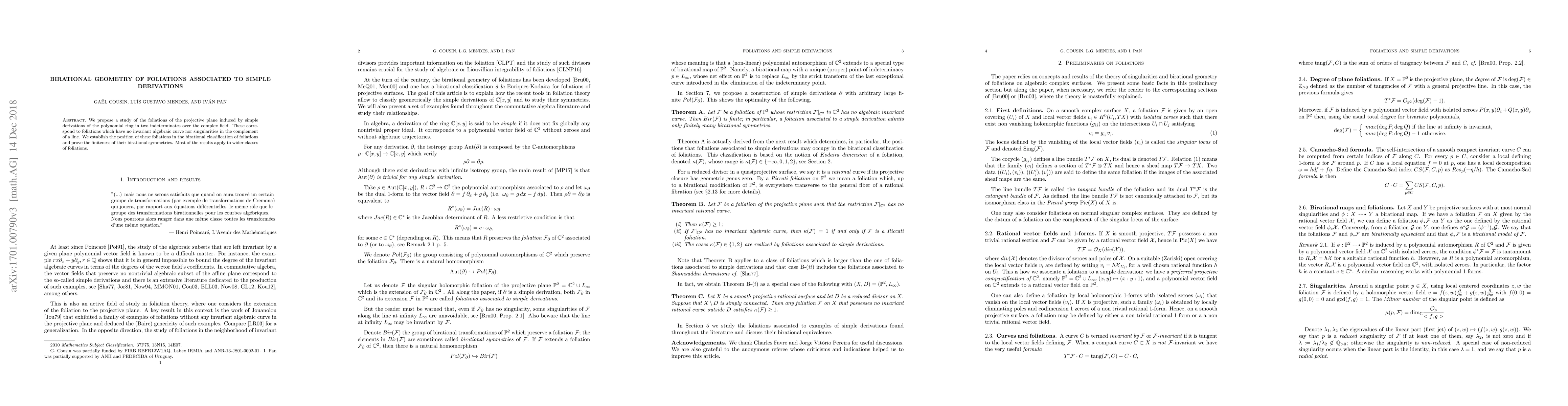 We propose a study of the foliations of the projective plane induced by simple derivations of the polynomial ring in two indeterminates over the complex field. These correspond to foliations which have no invariant algebraic curve nor singularities in the complement of a line. We establish the position of these foliations in the birational classification of foliations and prove the finiteness of their birational symmetries. Most of the results apply to wider classes of foliations.
