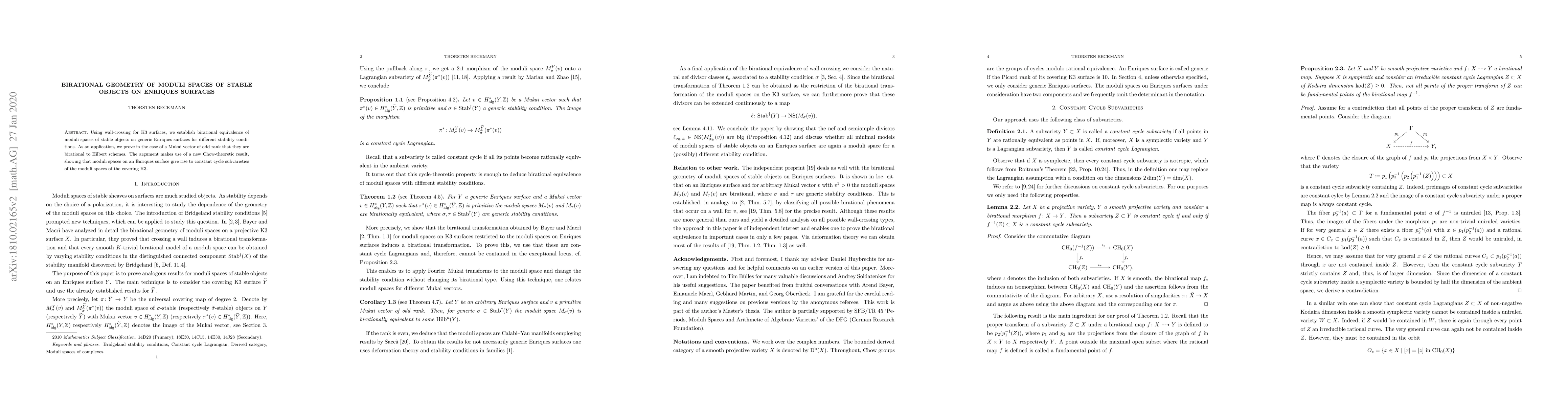 Summary: This paper demonstrates birational equivalence of moduli spaces of stable objects on generic Enriques surfaces through wall-crossing theory, showing they relate to Hilbert schemes for odd rank Mukai vectors, underpinned by a novel Chow-theoretic finding of constant cycle subvarieties in covering K3 moduli spaces.