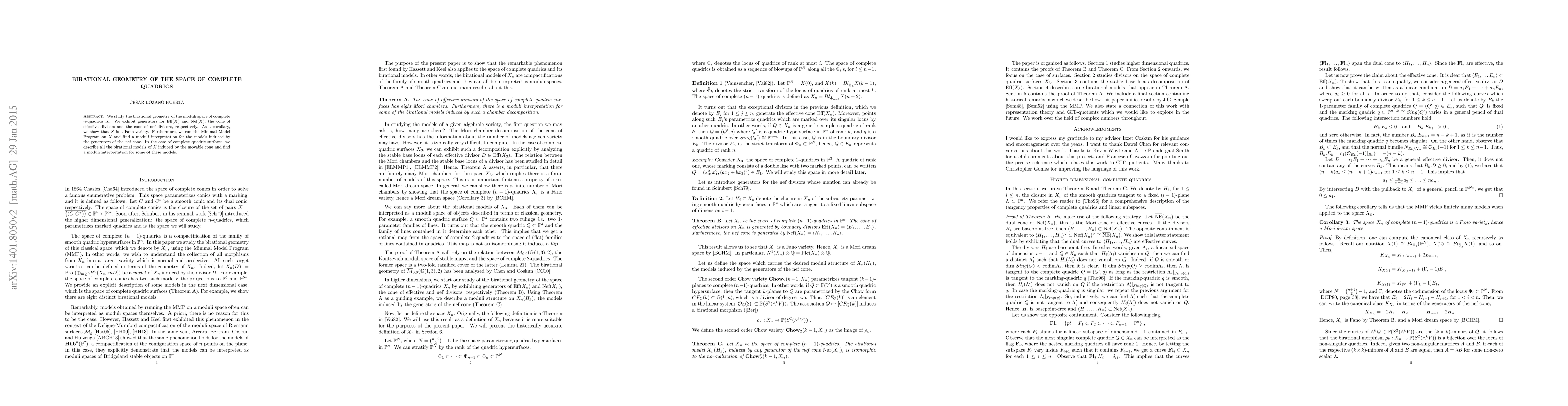 We study the birational geometry of the moduli space of complete $n$-quadrics $X$. We exhibit generators for Eff$(X)$ and Nef$(X)$, the cone of effective divisors and the cone of nef divisors, respectively. As a corollary X is a Mori Dream space. Furthermore, we run the MMP on $X$ and find a moduli interpretation for the models induced by the generators of the nef cone. In the case of complete quadric surfaces, we describe all the birational models of $X$ induced by the movable cone and find a moduli interpretation for some of these models.