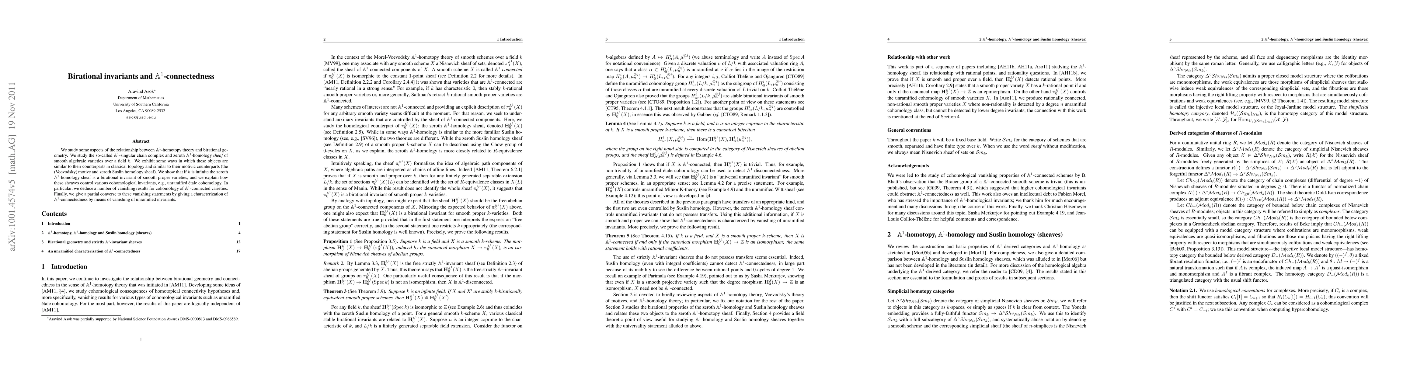 The paper studies the relationship between A^1-homotopy theory and birational geometry, focusing on the A^1-singular chain complex and zeroth A^1-homology sheaf of smooth algebraic varieties over a field k.