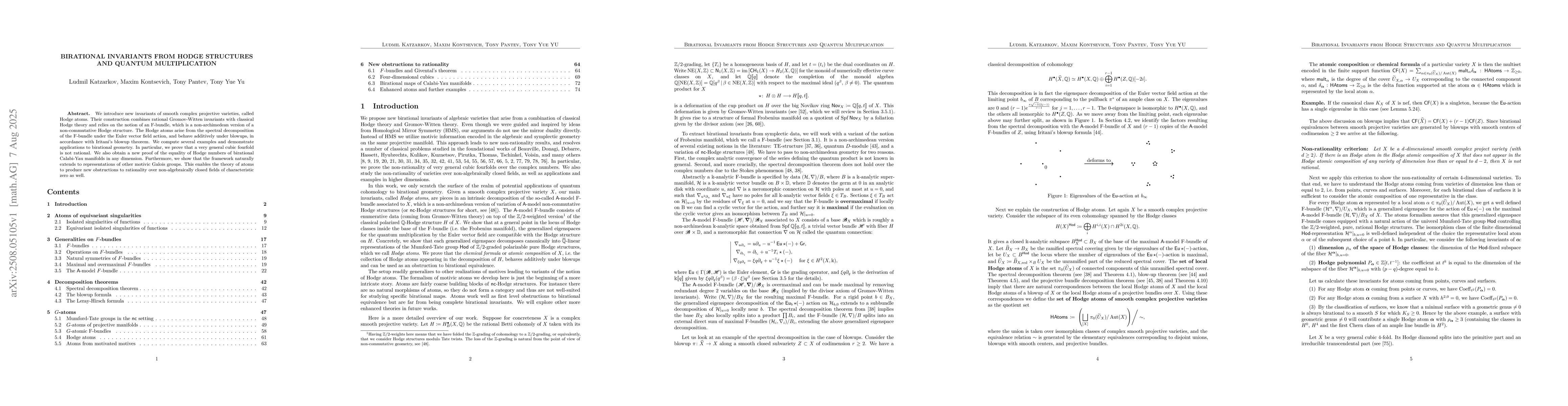 We introduce new invariants of smooth complex projective varieties, called Hodge atoms. Their construction combines rational Gromov-Witten invariants with classical Hodge theory and relies on the notion of an F-bundle, which is a non-archimedean version of a non-commutative Hodge structure. The Hodge atoms arise from the spectral decomposition of the F-bundle under the Euler vector field action, and behave additively under blowups, in accordance with Iritani's blowup theorem. We compute several examples and demonstrate applications to birational geometry. In particular, we prove that a very general cubic fourfold is not rational. We also obtain a new proof of the equality of Hodge numbers of birational Calabi-Yau manifolds in any dimension. Furthermore, we show that the framework naturally extends to representations of other motivic Galois groups. This enables the theory of atoms to produce new obstructions to rationality over non-algebraically closed fields of characteristic zero as well.