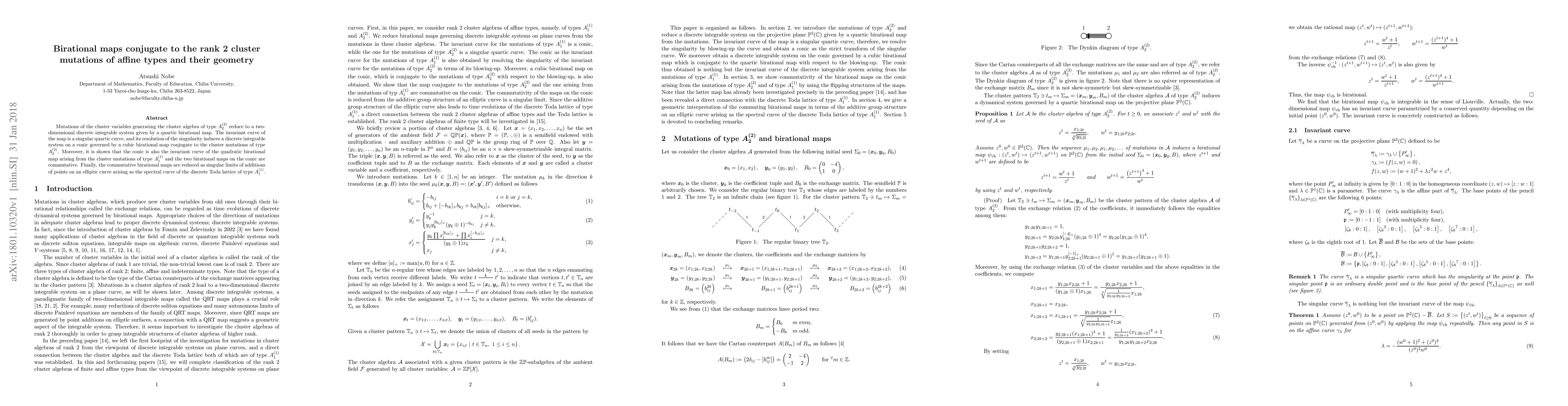 Mutations of the cluster variables generating the cluster algebra of type $A^{(2)}_2$ reduce to a two-dimensional discrete integrable system given by a quartic birational map. The invariant curve of the map is a singular quartic curve, and its resolution of the singularity induces a discrete integrable system on a conic governed by a cubic birational map conjugate to the cluster mutations of type $A^{(2)}_2$. Moreover, it is shown that the conic is also the invariant curve of the quadratic birational map arising from the cluster mutations of type $A^{(1)}_1$ and the two birational maps on the conic are commutative. Finally, the commutative birational maps are reduced as singular limits of additions of points on an elliptic curve arising as the spectral curve of the discrete Toda lattice of type $A^{(1)}_1$.