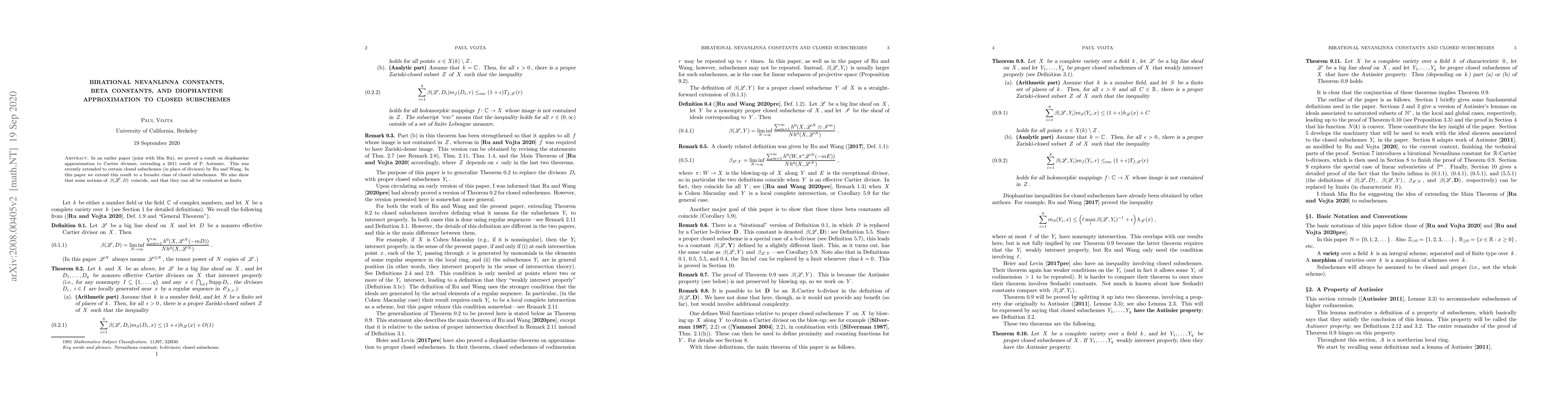 In an earlier paper (joint with Min Ru), we proved a result on diophantine approximation to Cartier divisors, extending a 2011 result of P. Autissier. This was recently extended to certain closed subschemes (in place of divisors) by Ru and Wang. In this paper we extend this result to a broader class of closed subschemes. We also show that some notions of $\beta(\mathscr L,D)$ coincide, and that they can all be evaluated as limits.