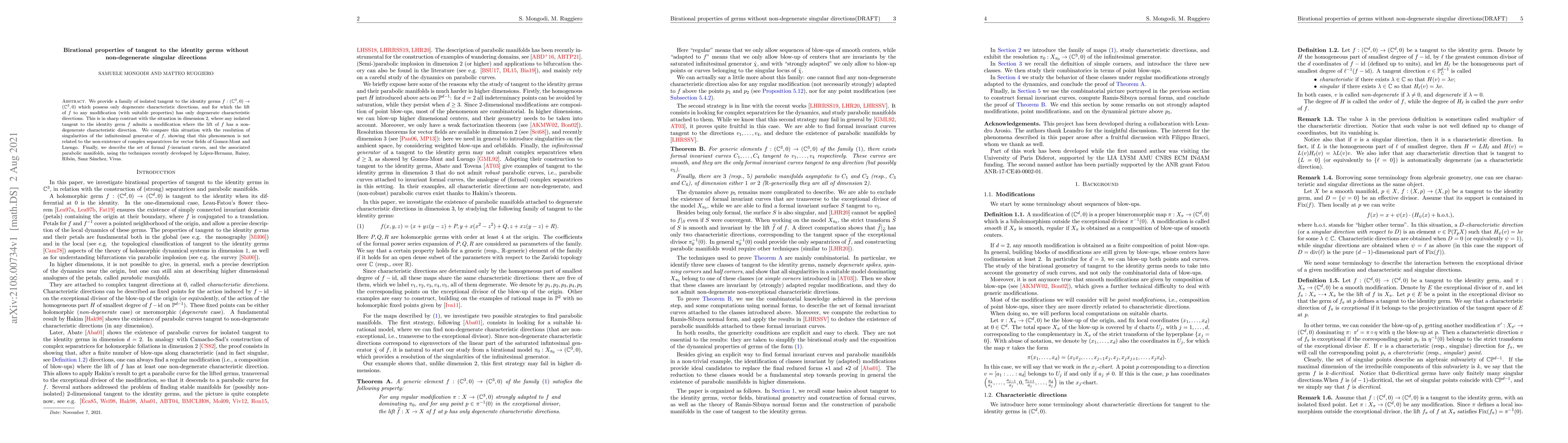 Researchers found a family of tangent functions to the identity germ with only degenerate characteristic directions, contrasting with similar cases in dimension 2 where modifications can have non-degenerate directions.