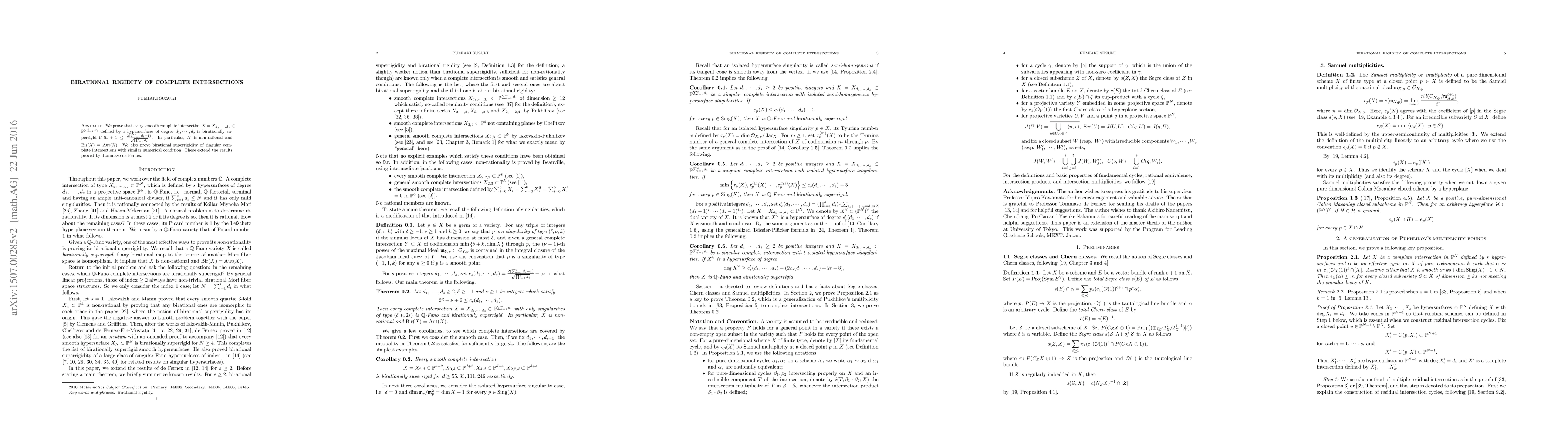 We prove that every smooth complete intersection X defined by s hypersurfaces of degree d_1, ... , d_s in a projective space of dimension d_1 + ... + d_s is birationally superrigid if 5s +1 is at most 2(d_1 + ... + d_s + 1)/sqrt{d_1...d_s}. In particular, X is non-rational and Bir(X)=Aut(X). We also prove birational superrigidity of singular complete intersections with similar numerical condition. These extend the results proved by Tommaso de Fernex.