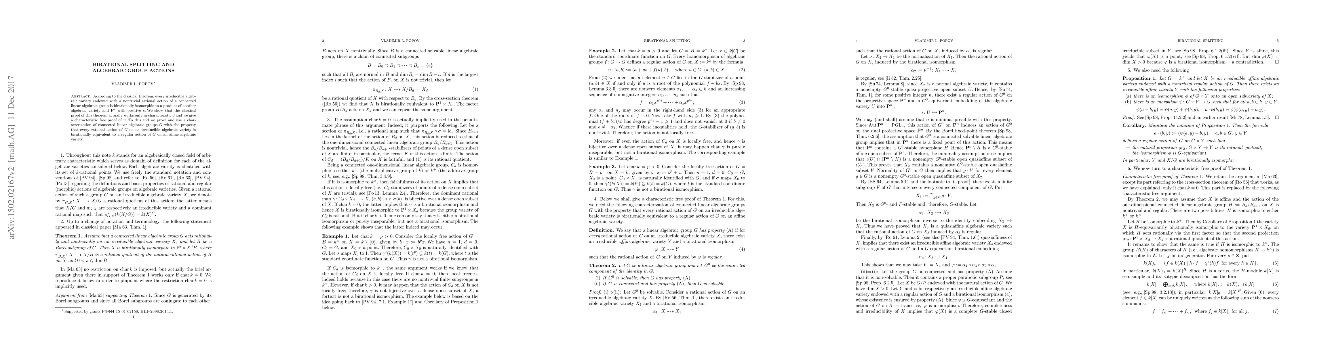 According to the classical theorem, every irreducible algebraic variety endowed with a nontrivial rational action of a connected linear algebraic group is birationally isomorphic to a product of another algebraic variety and ${\bf P}^s$ with positive $s$. We show that the classical proof of this theorem actually works only in characteristic $0$ and we give a characteristic free proof of it. To this end we prove and use a characterization of connected linear algebraic groups $G$ with the property that every rational action of $G$ on an irreducible algebraic variety is birationally equivalent to a regular action of $G$ on an affine algebraic variety.