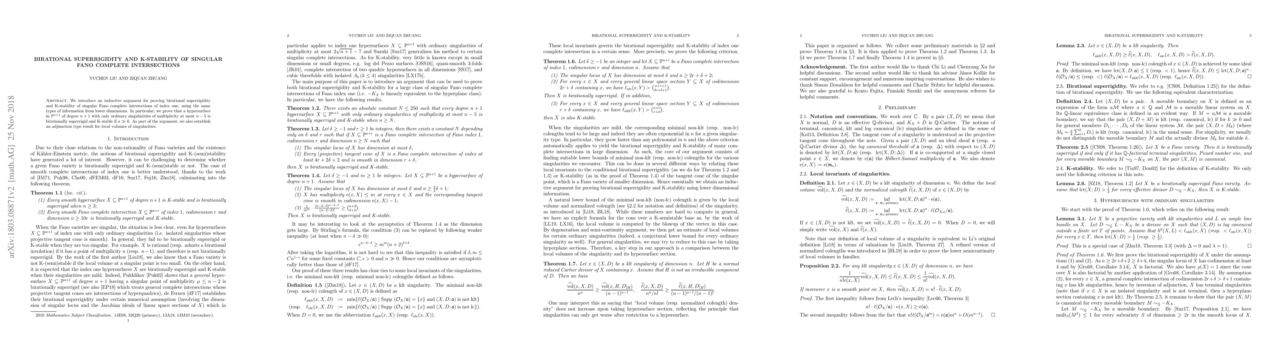 This paper proves birational superrigidity and K-stability for singular Fano complete intersections of index one using an inductive argument, showing that certain hypersurfaces in $\mathbb{P}^{n+1}$ with specific singularity conditions are birationally superrigid and K-stable for large $n$. It also establishes an adjunction result for local volumes of singularities.