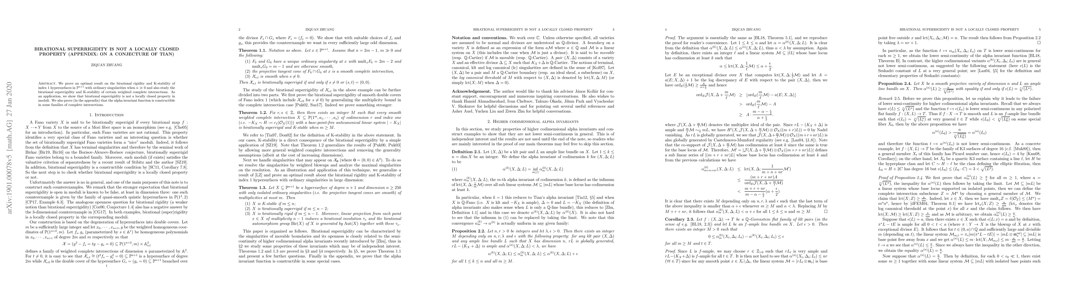 We prove an optimal result on the birational rigidity and K-stability of index $1$ hypersurfaces in $\mathbb{P}^{n+1}$ with ordinary singularities when $n\gg 0$ and also study the birational superrigidity and K-stability of certain weighted complete intersections. As an application, we show that birational superrigidity is not a locally closed property in moduli. We also prove (in the appendix) that the alpha invariant function is constructible in some families of complete intersections.