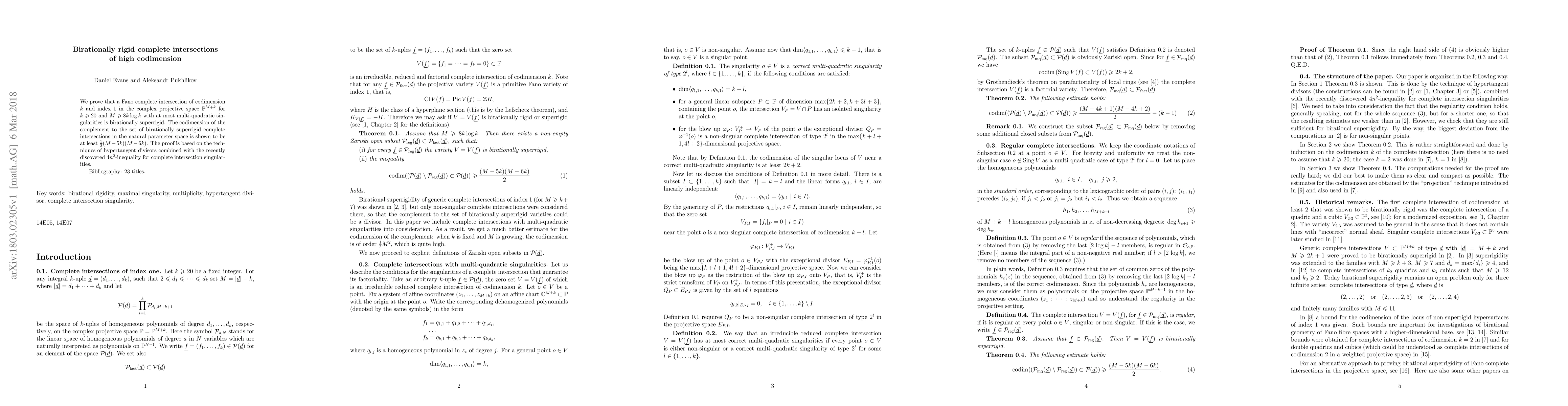 This paper proves that Fano complete intersections of codimension $k\geq 20$ in ${\mathbb P}^{M+k}$ with $M\geq 8k\log k$ and at most multi-quadratic singularities are birationally superrigid. The complement of birationally superrigid complete intersections has a codimension of at least $\frac12 (M-5k)(M-6k)$. The proof utilizes hypertangent divisors and the $4n^2$-inequality for singularities.