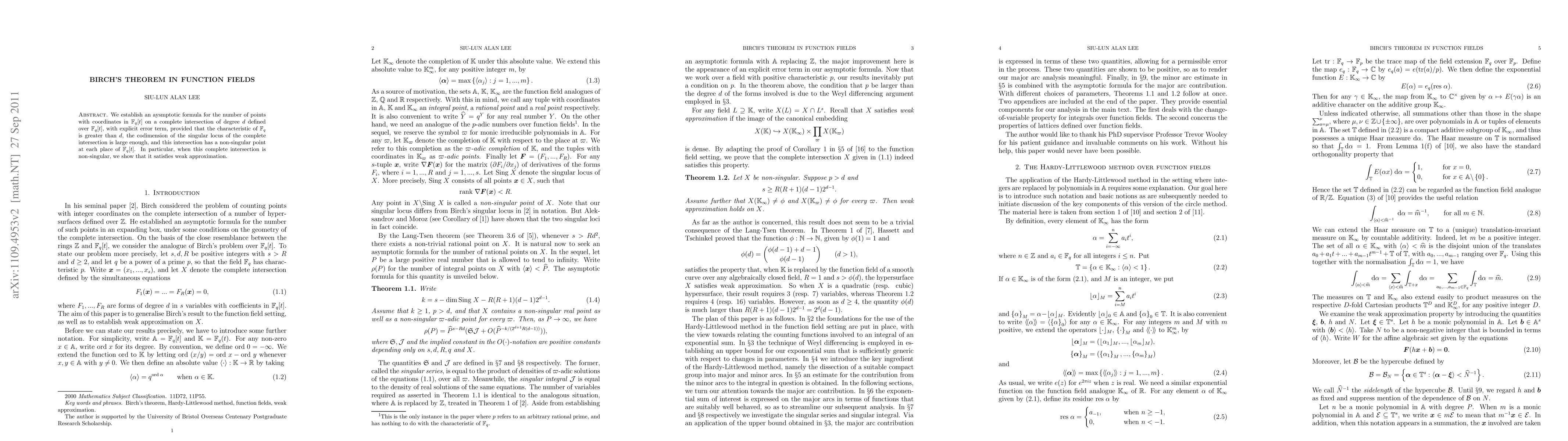 We establish an aysmptotic formula for the number of points with coordinates in $\mb{F}_q[t]$ on a complete intersection of degree $d$ defined over $\mb{F}_q[t]$, with explicit error term, provided that the characteristic of $\mb{F}_q$ is greater than $d$, the codimension of the singular locus of the complete intersection is large enough, and this intersection has a non-singular point at each place of $\mb{F}_q[t]$. In particular, when this complete intersection is non-singular, we show that it satisfies weak approximation.