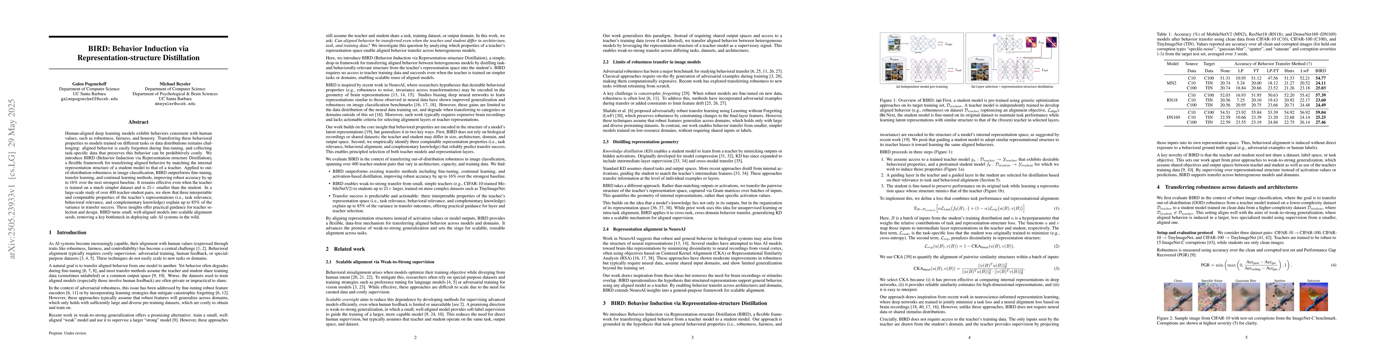 BIRD introduces a representation-structure distillation method for transferring aligned behavior between models, utilizing interpretable properties of teacher representations to explain transfer success.