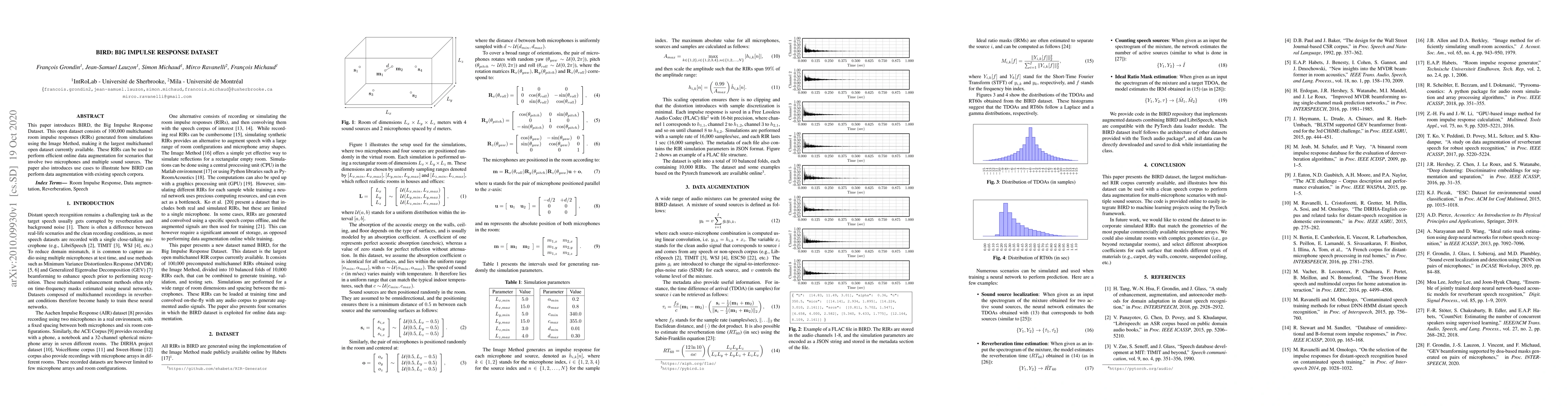 Summary: The paper presents BIRD, a large open dataset of 100,000 multichannel room impulse responses generated via simulations, which can enhance data augmentation for audio scenarios involving two microphones and multiple sound sources. It demonstrates its utility in augmenting existing speech corpora.