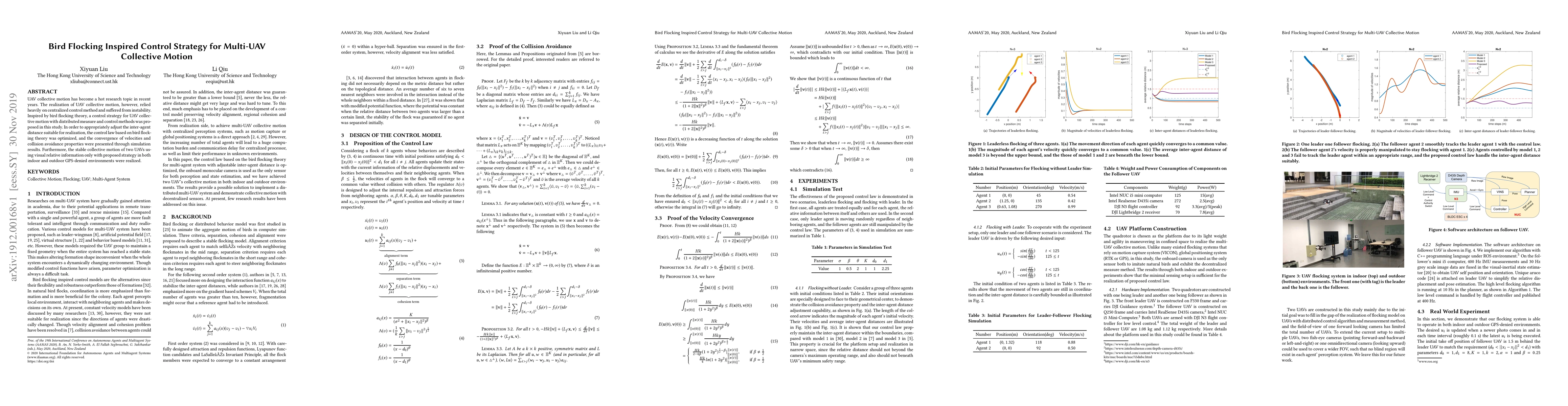 This paper proposes a distributed control strategy inspired by bird flocking for multi-UAV collective motion, optimizing the control law to ensure stable, collision-free UAV movement. Simulation results demonstrate the effectiveness of the strategy in both indoor and outdoor GPS-denied environments.