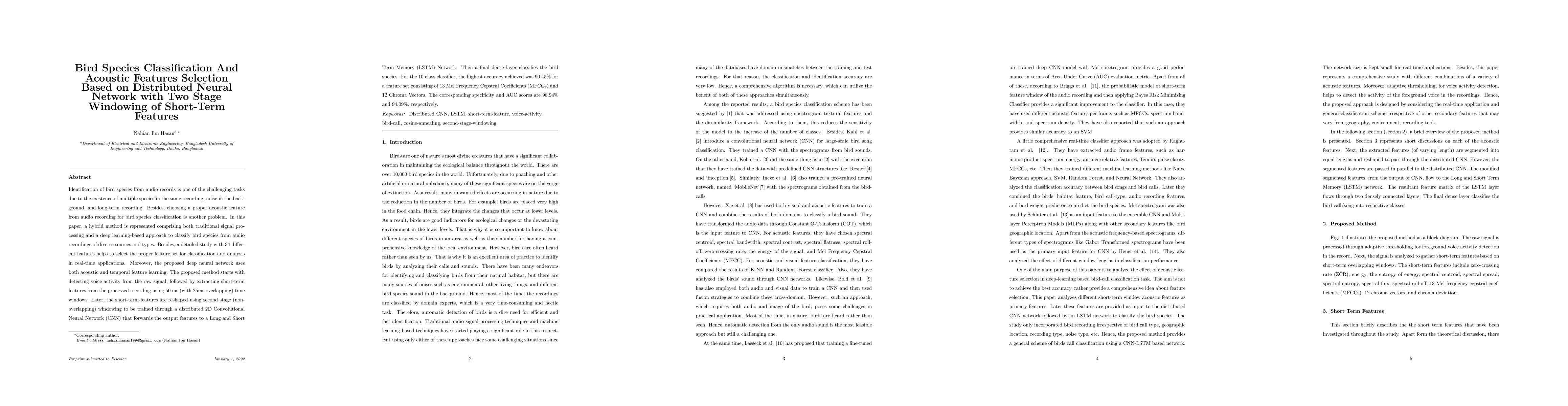 This paper proposes a hybrid method combining traditional signal processing and deep learning to classify bird species from audio recordings. The method uses distributed neural networks with two-stage windowing of short-term features, achieving 90.45% accuracy for a 10-class classifier, with 98.94% specificity and 94.09% AUC.