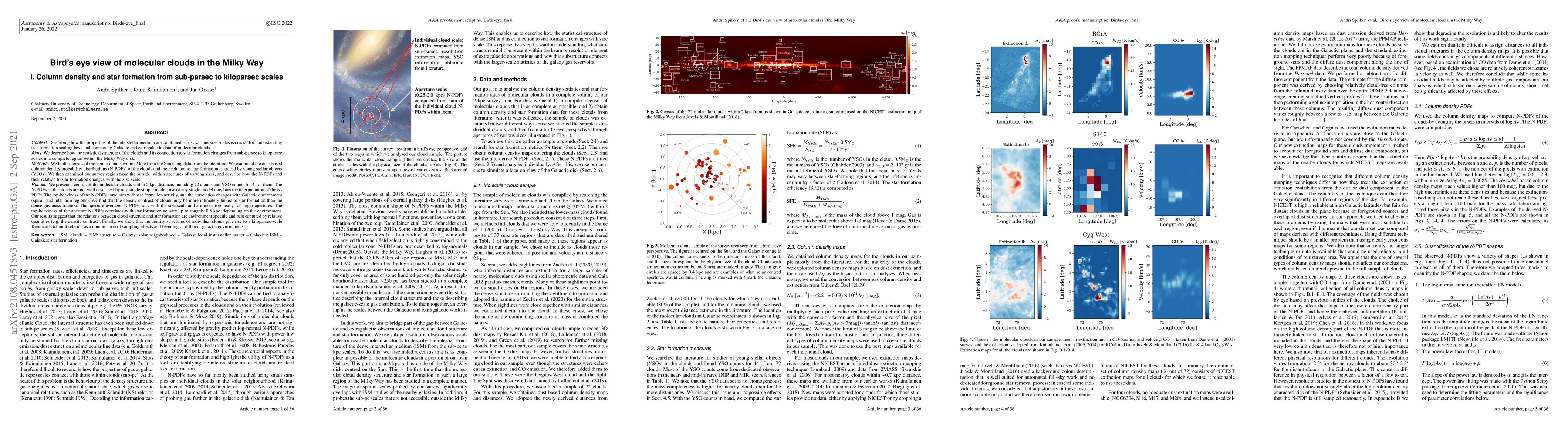 Describing how the properties of the interstellar medium combine across size-scales is crucial for understanding star formation scaling laws and connecting Galactic and extragalactic data of molecular clouds. We describe how the statistical structure of clouds, and its connection to star formation, changes from sub-parsec to kiloparsec scales in a complete region within the Milky Way disk. We build a census of molecular clouds within 2 kpc from the Sun using literature. We examine the dust-based column density probability distributions (N-PDFs) of the clouds and their relation to star formation traced by young stellar objects (YSOs). We then examine our survey region from the outside, within apertures of varying sizes, and describe how the N-PDFs and their relation to star formation changes with the size-scale. The N-PDFs of the clouds are not well described by any single simple model; use of any single model may bias the interpretation of the N-PDFs. The top-heaviness of the N-PDFs correlates with star formation activity, and the correlation changes with Galactic environment (spiral-/inter-arm regions). We find that the density contrast of clouds may be more intimately linked to star formation than the dense gas mass fraction. The aperture-averaged N-PDFs vary with the size-scale and are more top-heavy for larger apertures. The top-heaviness of the aperture N-PDFs correlates with star formation activity up to roughly 0.5 kpc size-scale, depending on the environment. Our results suggest that the relations between cloud structure and star formation are environment specific and best captured by relative quantities (e.g., the density contrast). Finally, we show how the density structures of individual clouds give rise to a kpc-scale Kennicutt-Schmidt relationship as a combination of sampling effects and blending of different galactic environments.