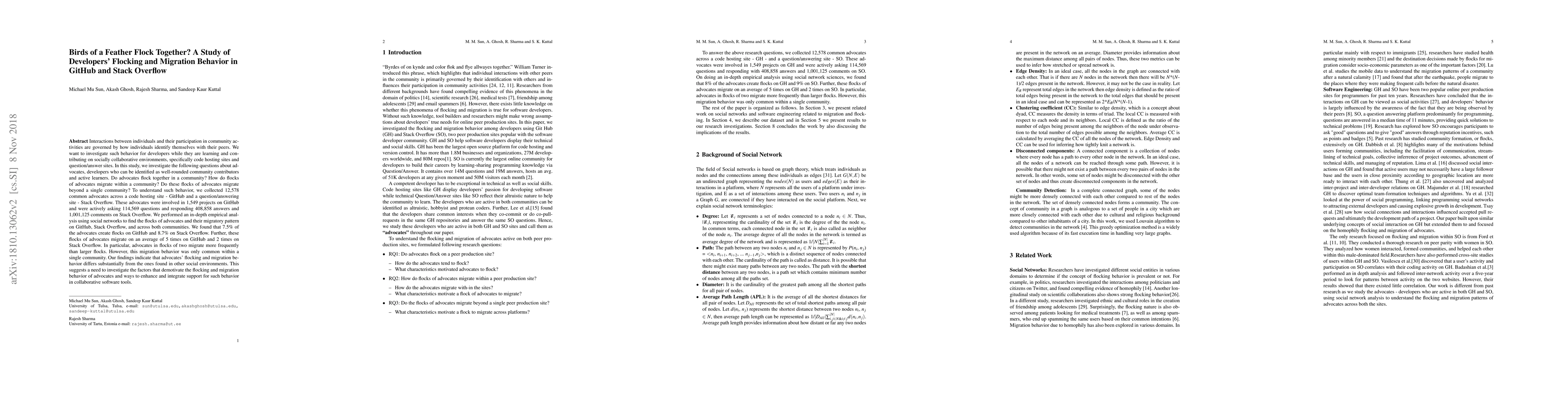 Interactions between individuals and their participation in community activities are governed by how individuals identify themselves with their peers. We want to investigate such behavior for developers while they are learning and contributing on socially collaborative environments, specifically code hosting sites and question/answer sites. In this study, we investigate the following questions about advocates, developers who can be identified as well-rounded community contributors and active learners. Do advocates flock together in a community? How do flocks of advocates migrate within a community? Do these flocks of advocates migrate beyond a single community? To understand such behavior, we collected 12,578 common advocates across a code hosting site - GitHub and a question/answering site - Stack Overflow. These advocates were involved in 1,549 projects on GitHub and were actively asking 114,569 questions and responding 408,858 answers and 1,001,125 comments on Stack Overflow. We performed an in-depth empirical analysis using social networks to find the flocks of advocates and their migratory pattern on GitHub, Stack Overflow, and across both communities. We found that 7.5% of the advocates create flocks on GitHub and 8.7% on Stack Overflow. Further, these flocks of advocates migrate on an average of 5 times on GitHub and 2 times on Stack Overflow. In particular, advocates in flocks of two migrate more frequently than larger flocks. However, this migration behavior was only common within a single community. Our findings indicate that advocates' flocking and migration behavior differs substantially from the ones found in other social environments. This suggests a need to investigate the factors that demotivate the flocking and migration behavior of advocates and ways to enhance and integrate support for such behavior in collaborative software tools.