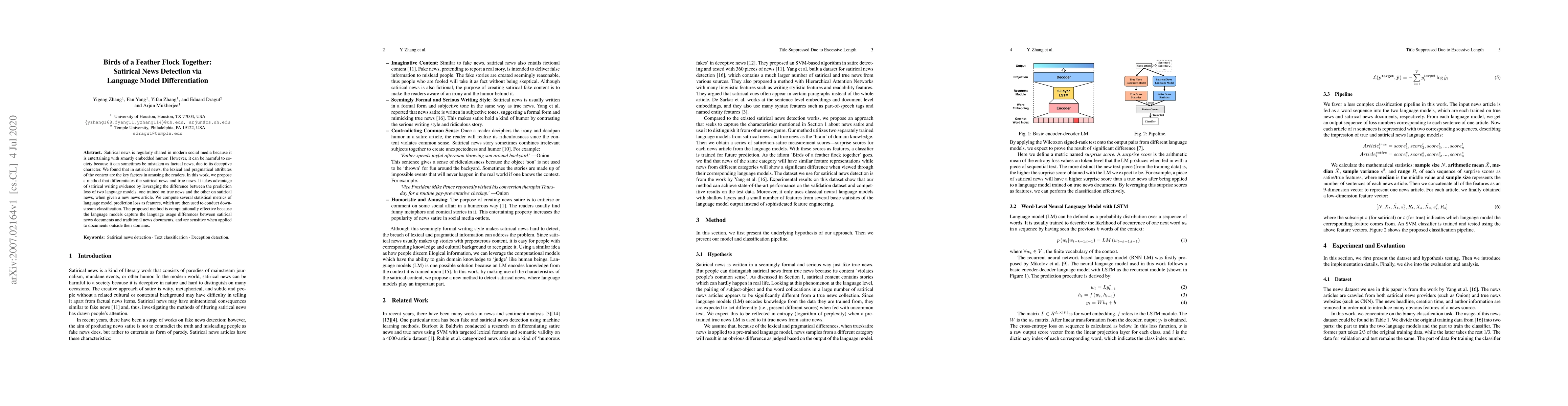 This research proposes a method to detect satirical news by analyzing the differences in language models trained on true and satirical news. It uses statistical metrics derived from the prediction loss of these models to classify news articles, effectively distinguishing between factual and satirical content.