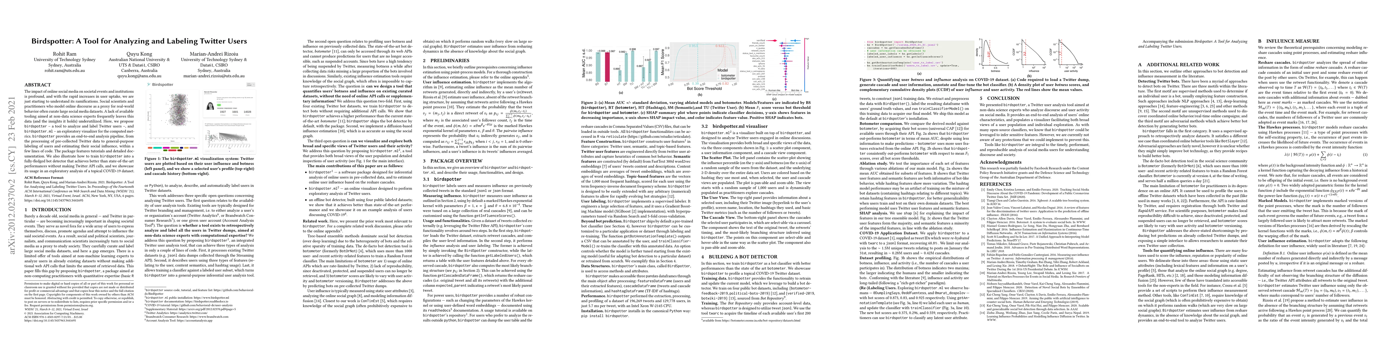 Birdspotter is a tool designed to analyze and label Twitter users, providing a user-friendly interface for social scientists and practitioners to curate large social media datasets without requiring advanced data science expertise. It also includes birdspotter.ml for visualizing computed metrics and demonstrates its effectiveness in detecting bots and analyzing COVID-19-related discourse.