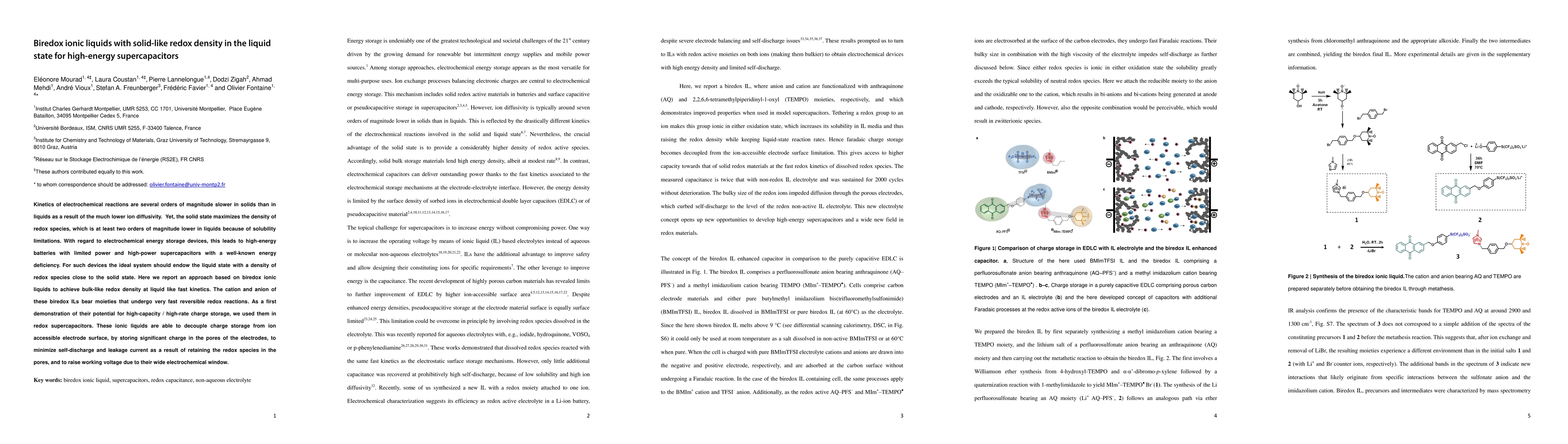 This paper presents biredox ionic liquids that combine the high redox density of solids with the fast kinetics of liquids, aiming to enhance the energy and power capabilities of supercapacitors. These ionic liquids demonstrate high-capacity and high-rate charge storage, minimizing self-discharge and increasing working voltage through effective redox species retention in electrode pores.