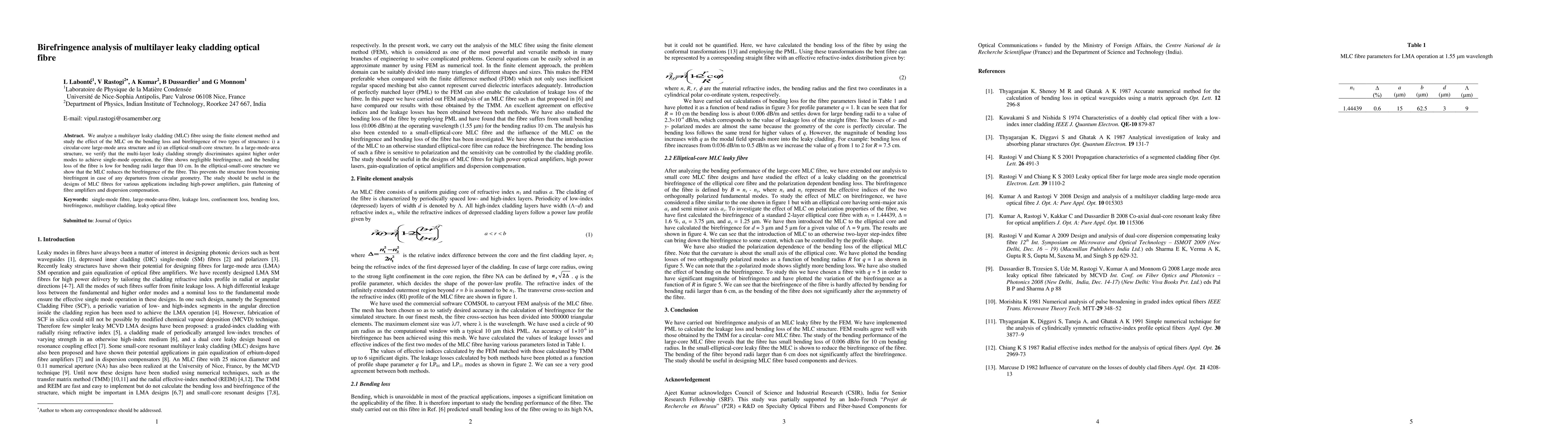 This paper analyzes multilayer leaky cladding (MLC) fibres using the finite element method to assess their bending loss and birefringence. The study finds that MLC fibres can achieve single-mode operation with low birefringence and bending loss in large-mode-area structures, while reducing birefringence in elliptical-small-core structures, making them suitable for high power amplifiers and other applications.