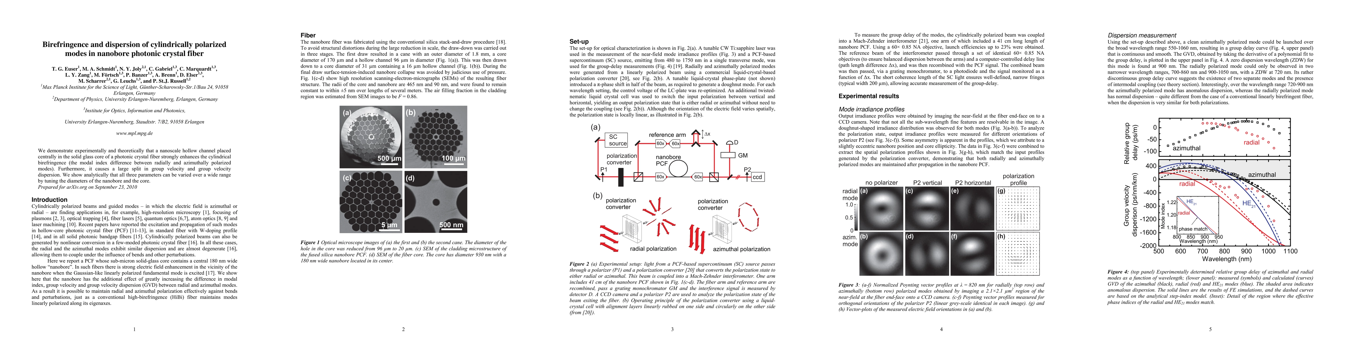 The paper presents experimental and theoretical evidence that a nanoscale hollow channel in a photonic crystal fiber's core significantly boosts cylindrical birefringence, causing a substantial split in group velocity and group velocity dispersion. These parameters can be adjusted widely by altering the diameters of the nanobore and the core.