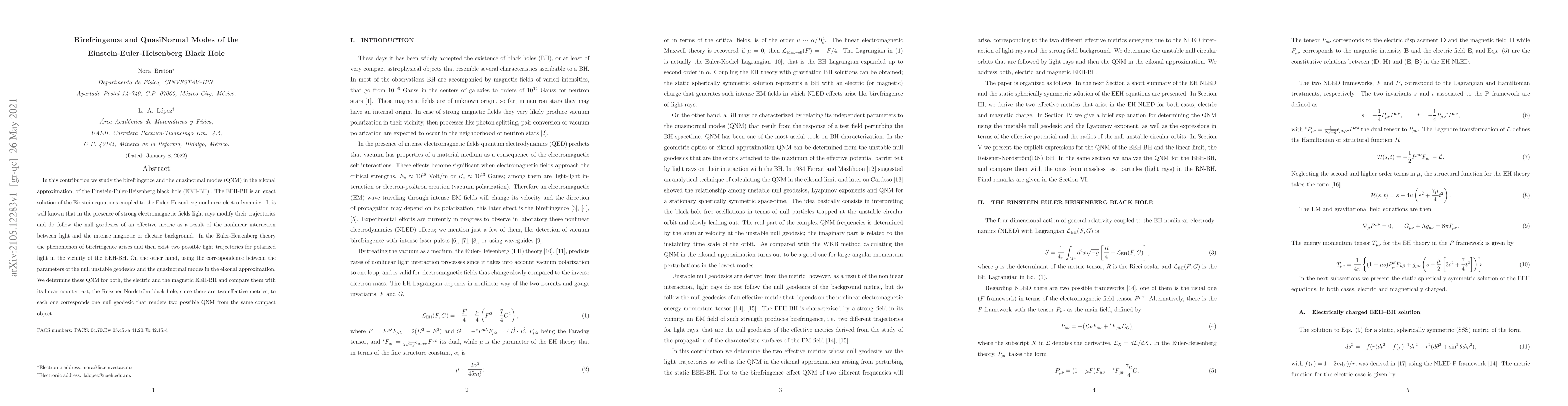 In this contribution we study the birefringence and the quasinormal modes (QNM) in the eikonal approximation, of the Einstein-Euler-Heisenberg black hole (EEH-BH) . The EEH-BH is an exact solution of the Einstein equations coupled to the Euler-Heisenberg nonlinear electrodynamics. It is well known that in the presence of strong electromagnetic fields light rays modify their trajectories and do follow the null geodesics of an effective metric as a result of the nonlinear interaction between light and the intense magnetic or electric background. In the Euler-Heisenberg theory the phenomenon of birefringence arises and then exist two possible light trajectories for polarized light in the vicinity of the EEH-BH. On the other hand, using the correspondence between the parameters of the null unstable geodesics and the quasinormal modes in the eikonal approximation. We determine these QNM for both, the electric and the magnetic EEH-BH and compare them with its linear counterpart, the Reissner-Nordstr\"{o}m black hole, since there are two effective metrics, to each one corresponds one null geodesic that renders two possible QNM from the same compact object.