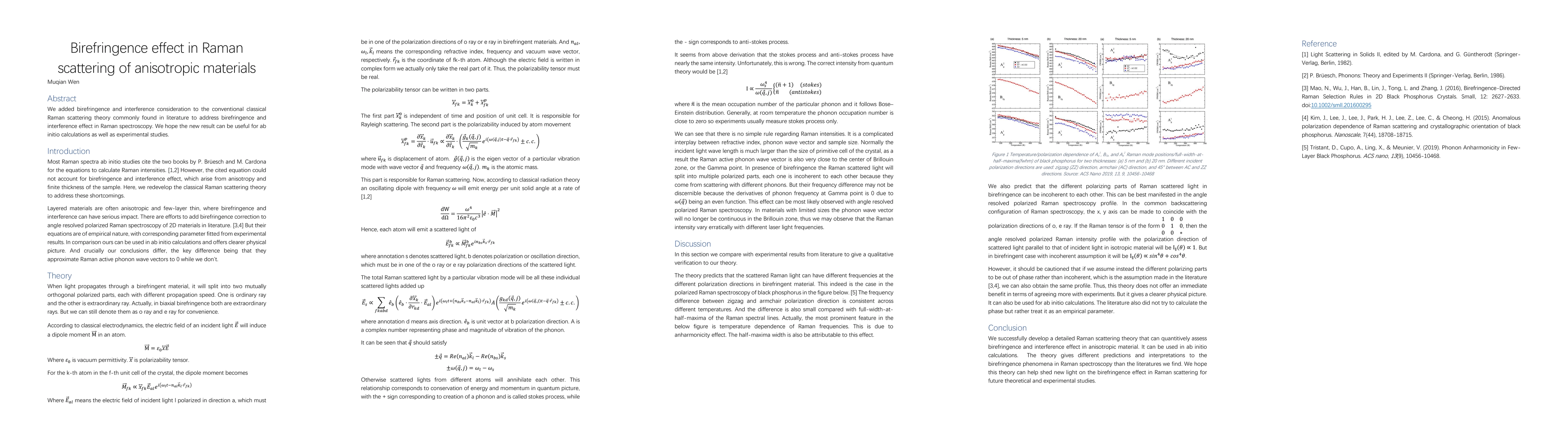 This paper extends classical Raman scattering theory by incorporating birefringence and interference effects, aiming to improve both ab initio calculations and experimental studies of anisotropic materials. The new model provides a more accurate framework for understanding Raman spectroscopy in birefringent materials.