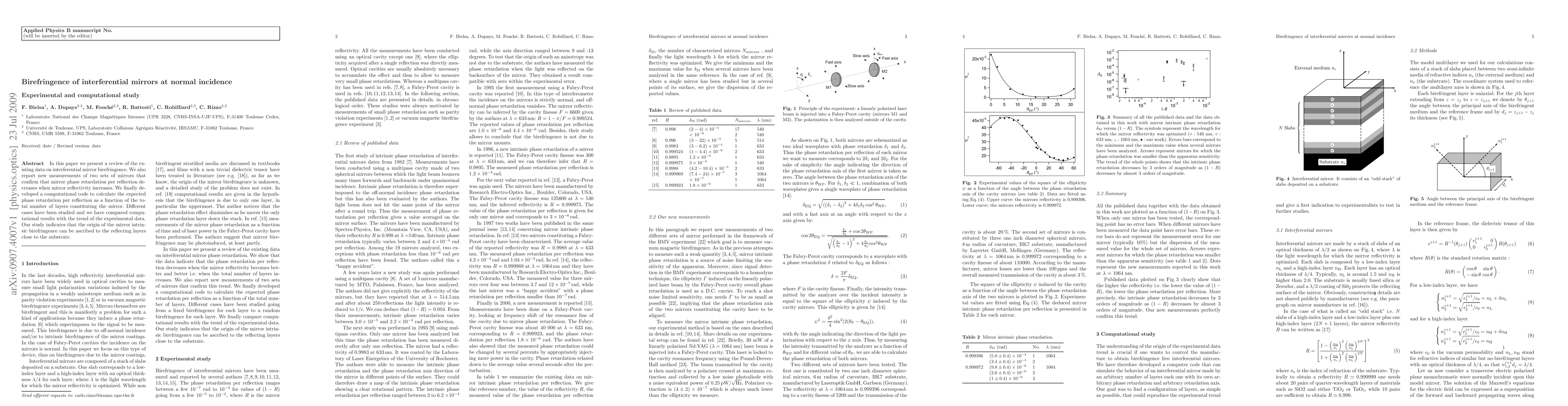 This paper reviews existing data on interferential mirror birefringence and reports new measurements confirming that mirror phase retardation decreases with increased reflectivity. The authors developed a computational model to predict phase retardation based on the number of mirror layers, comparing results with experimental trends and attributing intrinsic birefringence to layers near the substrate.