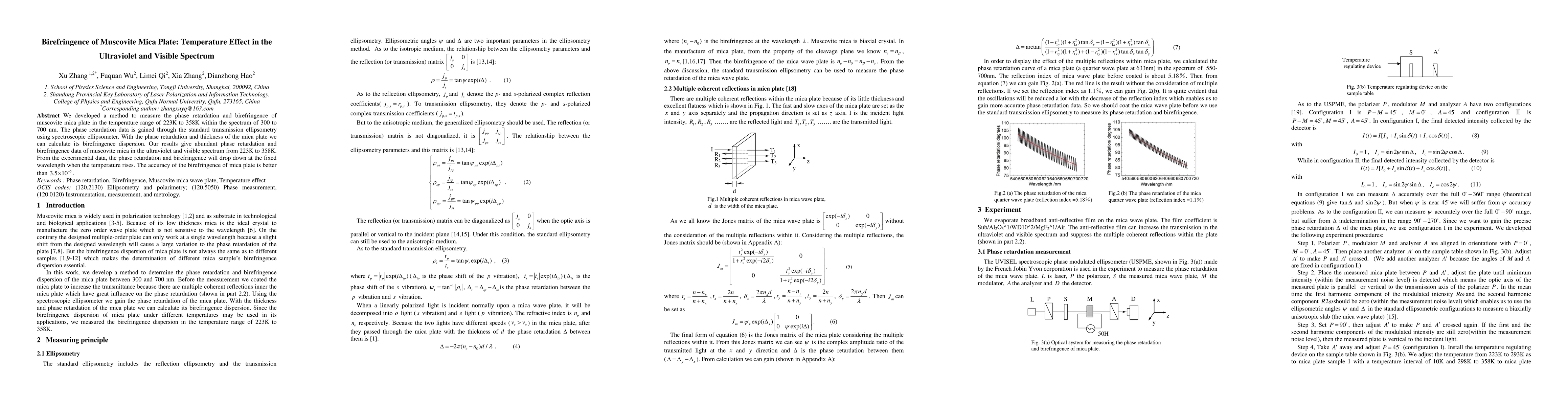 This study measures the phase retardation and birefringence of muscovite mica plates in the temperature range of 223K to 358K using spectroscopic ellipsometry. Results show a decrease in phase retardation and birefringence with increasing temperature, with an accuracy better than 3.5e-5.