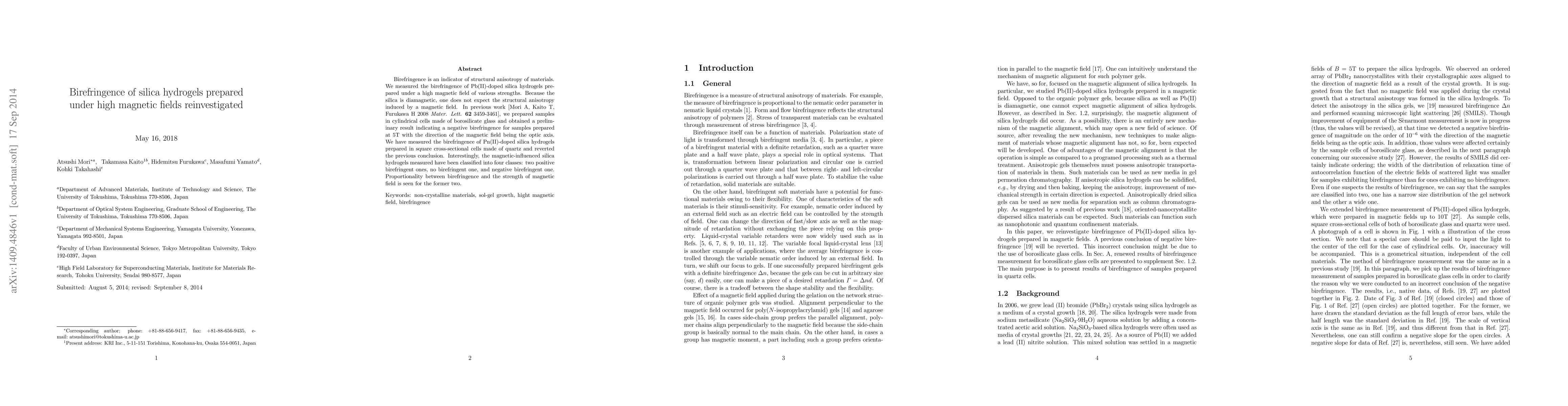 Birefringence is an indicator of structural anisotropy of materials. We measured the birefringence of Pb(II)-doped silica hydrogels prepared under a high magnetic field of various strengths. Because the silica is diamagnetic, one does not expect the structural anisotropy induced by a magnetic field. In previous work [Mori A, Kaito T, Furukawa H 2008 Mater. Lett. 62 3459-3461], we prepared samples in cylindrical cells made of borosilicate glass and obtained a preliminary result indicating a negative birefringence for samples prepared at 5T with the direction of the magnetic field being the optic axis. We have measured the birefringence of Pn(II)-doped silica hydrogels prepared in square cross-sectional cells made of quartz and reverted the previous conclusion. Interestingly, the magnetic-influenced silica hydrogels measured have been classified into four classes: two positive birefringent ones, no birefringent one, and negative birefringent one. Proportionality between birefringence and the strength of magnetic field is seen for the former two.