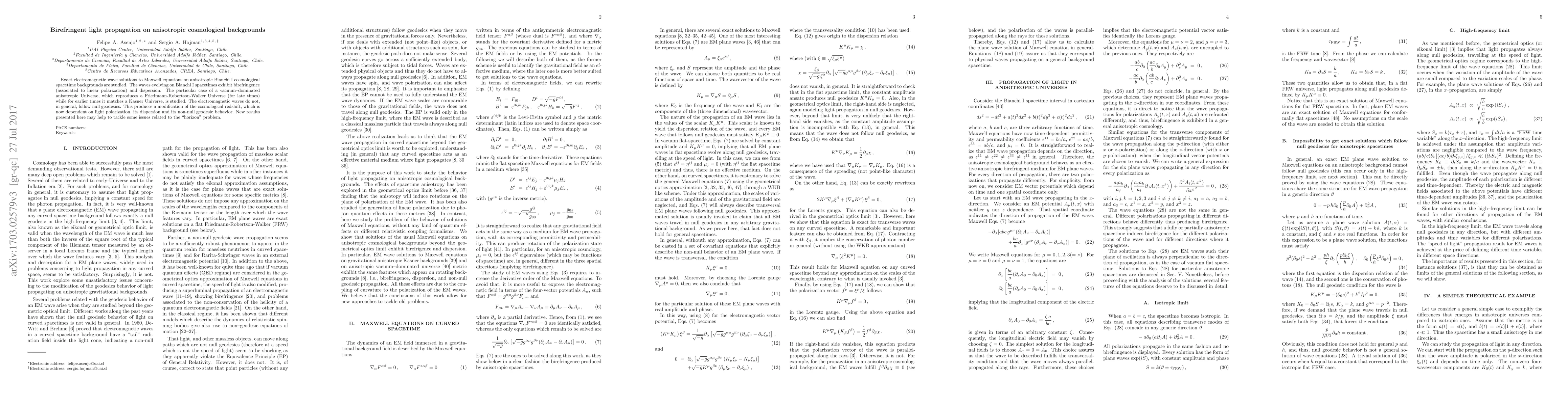 This research derives exact electromagnetic wave solutions on anisotropic Bianchi I cosmic backgrounds, exhibiting birefringence and dispersion. It explores a vacuum-dominated anisotropic universe that transitions from a Kasner to a Friedmann-Robertson-Walker universe, showing that light doesn't follow null geodesics, thus modifying cosmological redshift depending on polarization and dispersion. These findings could address aspects of the 'horizon' problem.