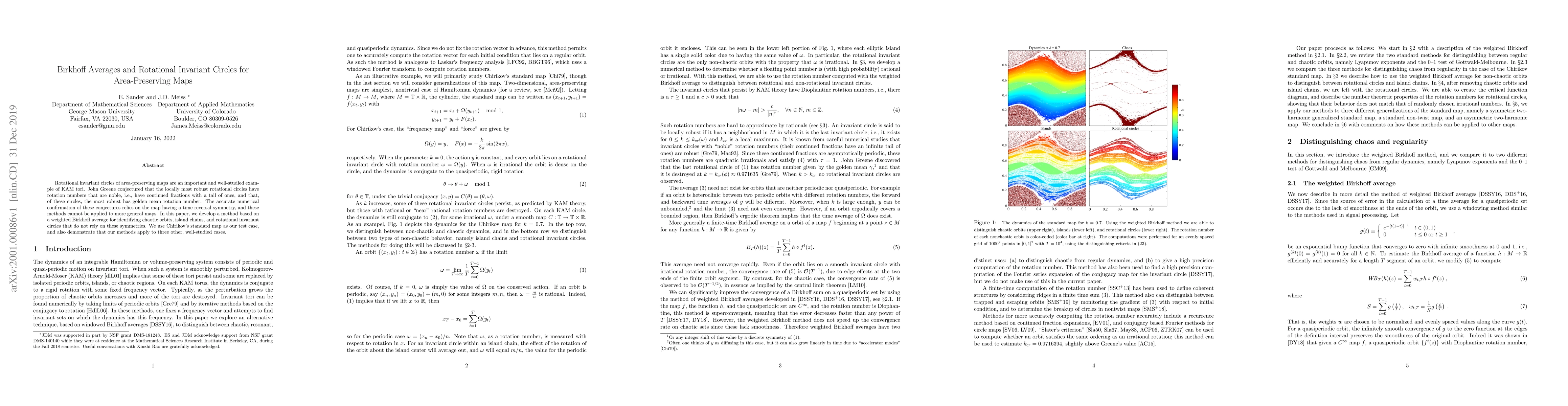 Rotational invariant circles of area-preserving maps are an important and well-studied example of KAM tori. John Greene conjectured that the locally most robust rotational circles have rotation numbers that are noble, i.e., have continued fractions with a tail of ones, and that, of these circles, the most robust has golden mean rotation number. The accurate numerical confirmation of these conjectures relies on the map having a time reversal symmetry, and these methods cannot be applied to more general maps. In this paper, we develop a method based on a weighted Birkhoff average for identifying chaotic orbits, island chains, and rotational invariant circles that do not rely on these symmetries. We use Chirikov's standard map as our test case, and also demonstrate that our methods apply to three other, well-studied cases.