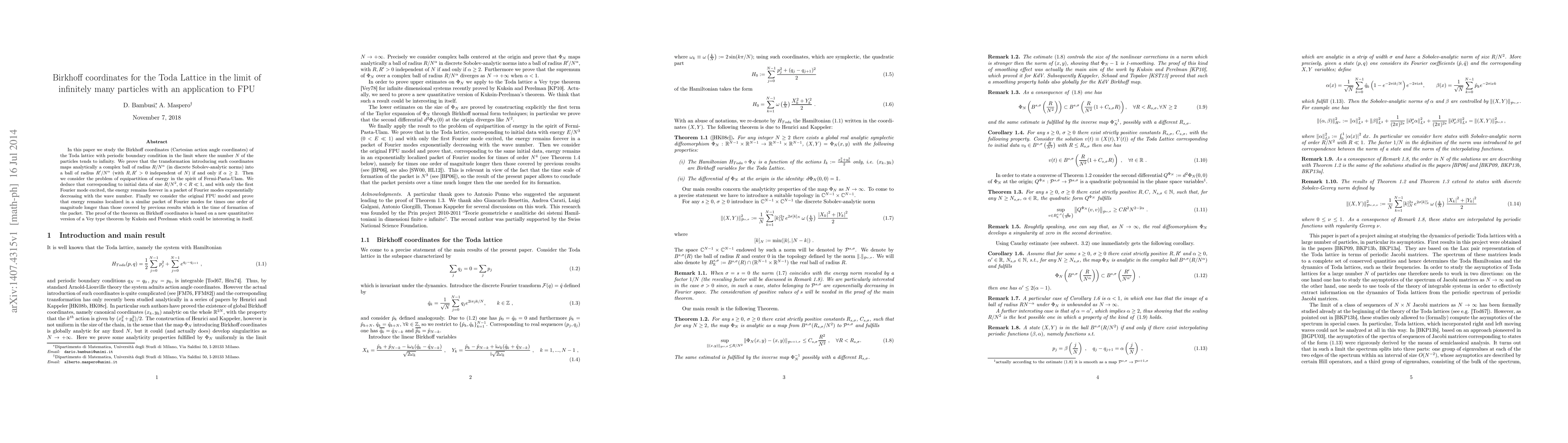 This paper investigates Birkhoff coordinates for the Toda lattice in the infinite particle limit, proving that the transformation into these coordinates is valid under certain conditions. It also shows that energy equipartition in the FPU model leads to energy localization in a packet of Fourier modes, extending previous results on the time scale of this localization.