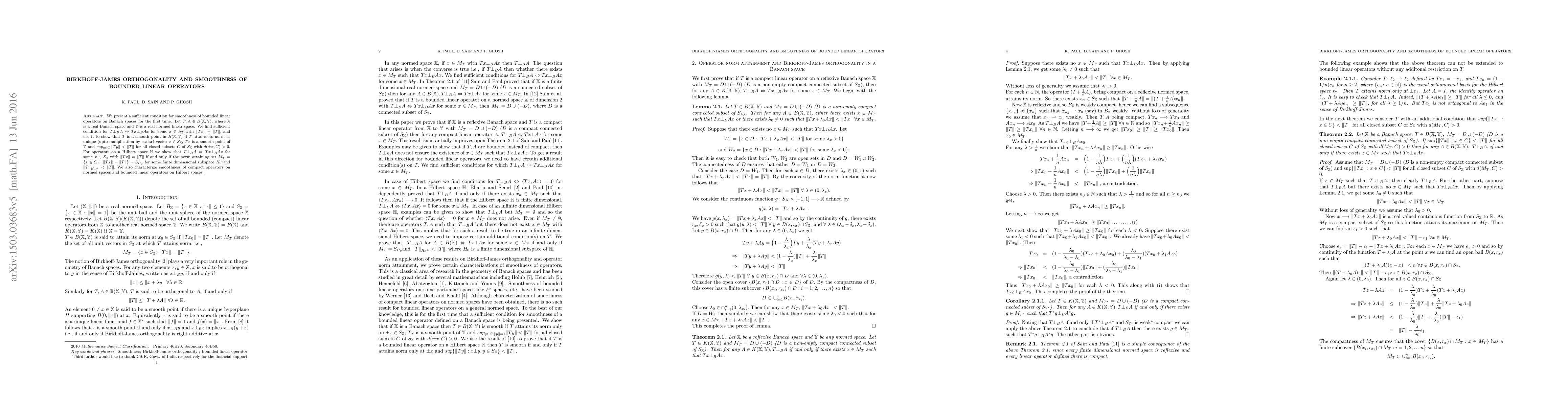 We present a sufficient condition for smoothness of bounded linear operators on Banach spaces for the first time. Let $T, A \in B(\mathbb{X}, \mathbb{Y}),$ where $\mathbb{X}$ is a real Banach space and $\mathbb{Y}$ is a real normed linear space. We find sufficient condition for $ T \bot_{B} A \Leftrightarrow Tx \bot_{B} Ax $ for some $ x \in S_{\mathbb{X}}$ with $ \|Tx\| = \|T\|, $ and use it to show that $T$ is a smooth point in $ B(\mathbb{X}, \mathbb{Y}) $ if $T$ attains its norm at unique (upto muliplication by scalar) vector $ x \in S_{\mathbb{X}},$ $Tx$ is a smooth point of $\mathbb{Y} $ and {\em sup}$_{y \in C} \|Ty\| < \|T\|$ for all closed subsets $C$ of $S_{\mathbb{X}}$ with $d(\pm x,C) > 0.$ For operators on a Hilbert space $ \mathbb{H}$ we show that $ T \bot_{B} A \Leftrightarrow Tx \bot_{B} Ax $ for some $ x \in S_{\mathbb{H}}$ with $ \|Tx\| = \|T\| $ if and only if the norm attaining set $M_T = \{ x \in S_{\mathbb{H}} : \|Tx\| = \|T\| \} = S_{H_0}$ for some finite dimensional subspace $H_0$ and $ \|T\|_{{H_o}^{\bot}} < \|T\|.$ We also characterize smoothness of compact operators on normed spaces and bounded linear operators on Hilbert spaces.