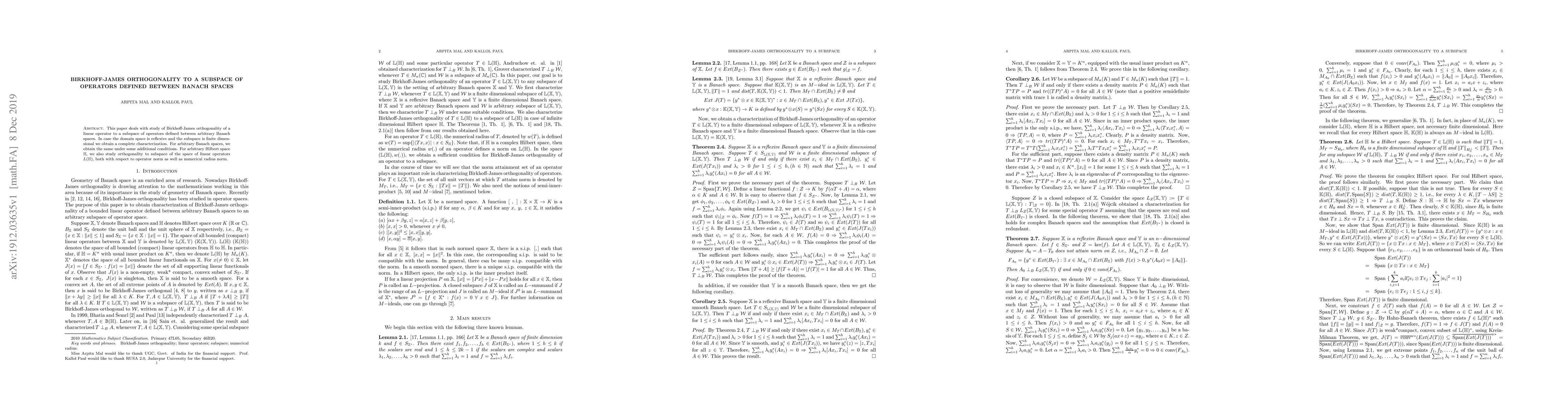 This paper characterizes Birkhoff-James orthogonality for a linear operator to a subspace of operators between Banach spaces, providing complete characterizations when the domain space is reflexive and the subspace is finite-dimensional, and studying orthogonality in Hilbert spaces with respect to operator and numerical radius norms.