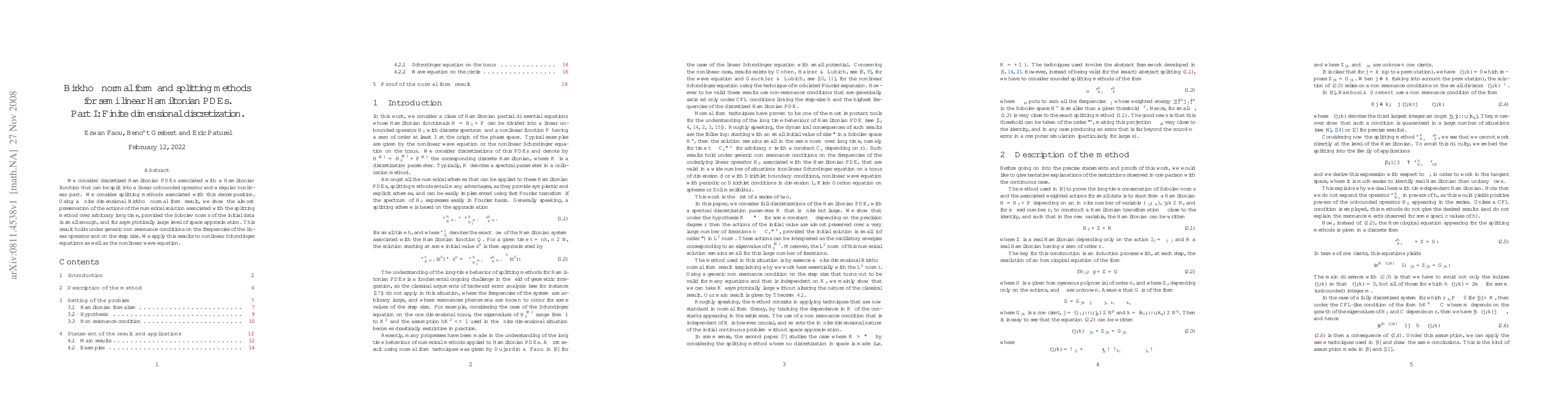 We consider {\em discretized} Hamiltonian PDEs associated with a Hamiltonian function that can be split into a linear unbounded operator and a regular nonlinear part. We consider splitting methods associated with this decomposition. Using a finite dimensional Birkhoff normal form result, we show the almost preservation of the {\em actions} of the numerical solution associated with the splitting method over arbitrary long time, provided the Sobolev norms of the initial data is small enough, and for asymptotically large level of space approximation. This result holds under {\em generic} non resonance conditions on the frequencies of the linear operator and on the step size. We apply this results to nonlinear Schr\"odinger equations as well as the nonlinear wave equation.}