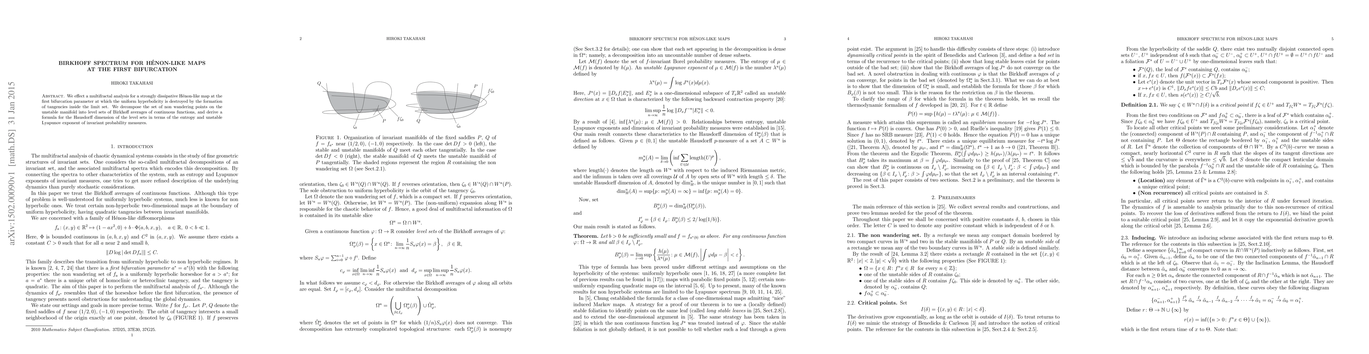 This paper conducts a multifractal analysis of a strongly dissipative H\'enon-like map at its first bifurcation, where hyperbolicity is lost due to tangencies. It derives a formula for the Hausdorff dimension of level sets in terms of entropy and the unstable Lyapunov exponent, based on Birkhoff averages of continuous functions.
