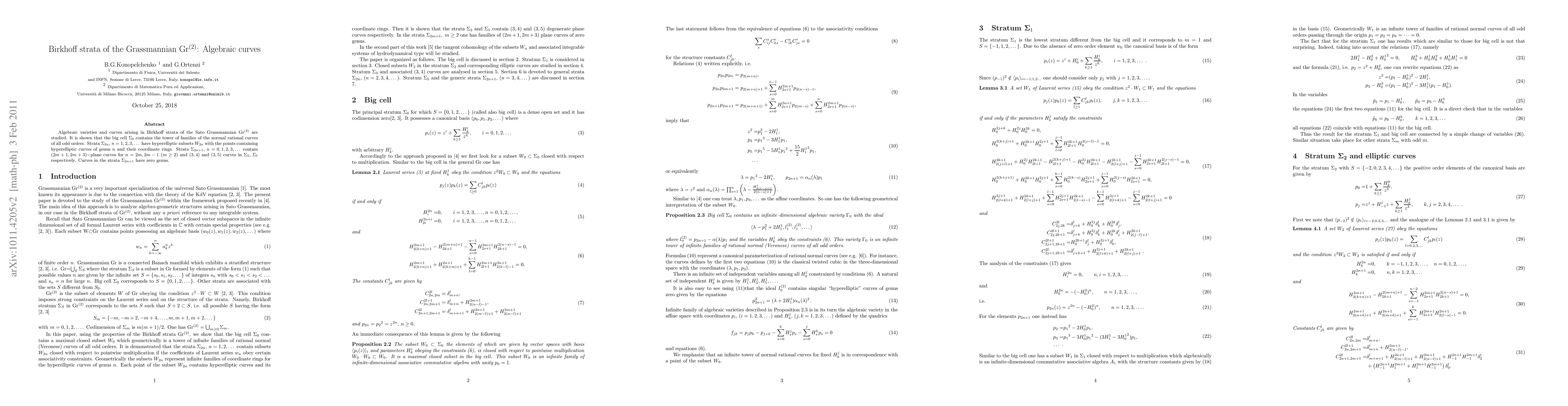 Algebraic varieties and curves arising in Birkhoff strata of the Sato Grassmannian Gr${^{(2)}}$ are studied. It is shown that the big cell $\Sigma_0$ contains the tower of families of the normal rational curves of all odd orders. Strata $\Sigma_{2n}$, $n=1,2,3,...$ contain hyperelliptic curves of genus $n$ and their coordinate rings. Strata $\Sigma_{2n+1}$, $n=0,1,2,3,...$ contain $(2m+1,2m+3)-$plane curves for $n=2m,2m-1$ $(m \geq 2)$ and $(3,4)$ and $(3,5)$ curves in $\Sigma_3$, $\Sigma_5$ respectively. Curves in the strata $\Sigma_{2n+1}$ have zero genus.