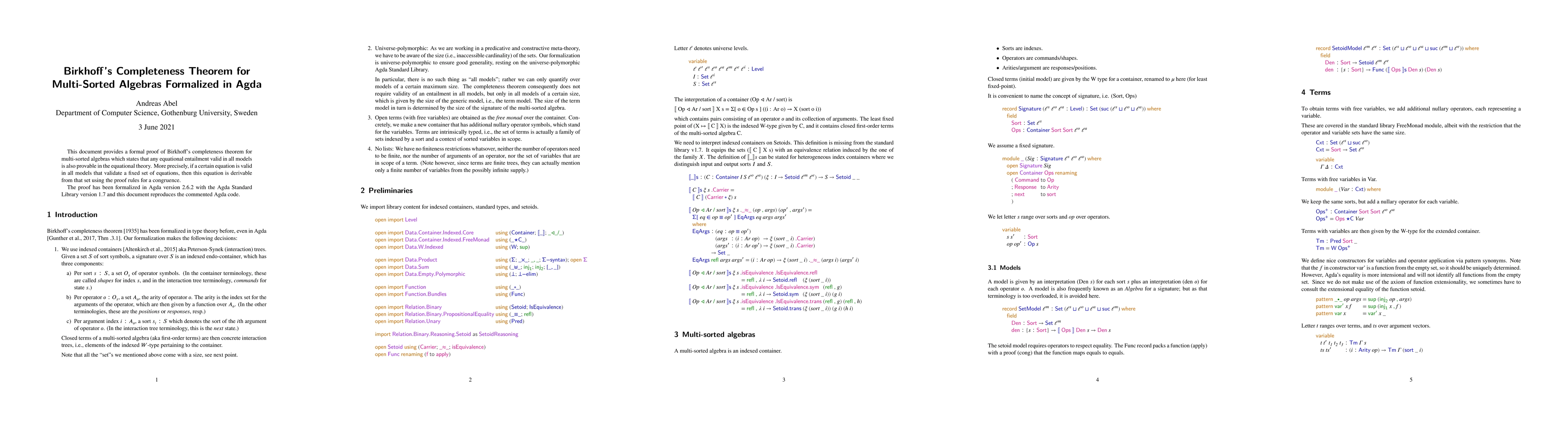 This document provides a formal proof of Birkhoff's completeness theorem for multi-sorted algebras which states that any equational entailment valid in all models is also provable in the equational theory. More precisely, if a certain equation is valid in all models that validate a fixed set of equations, then this equation is derivable from that set using the proof rules for a congruence. The proof has been formalized in Agda version 2.6.2 with the Agda Standard Library version 1.7 and this document reproduces the commented Agda code.