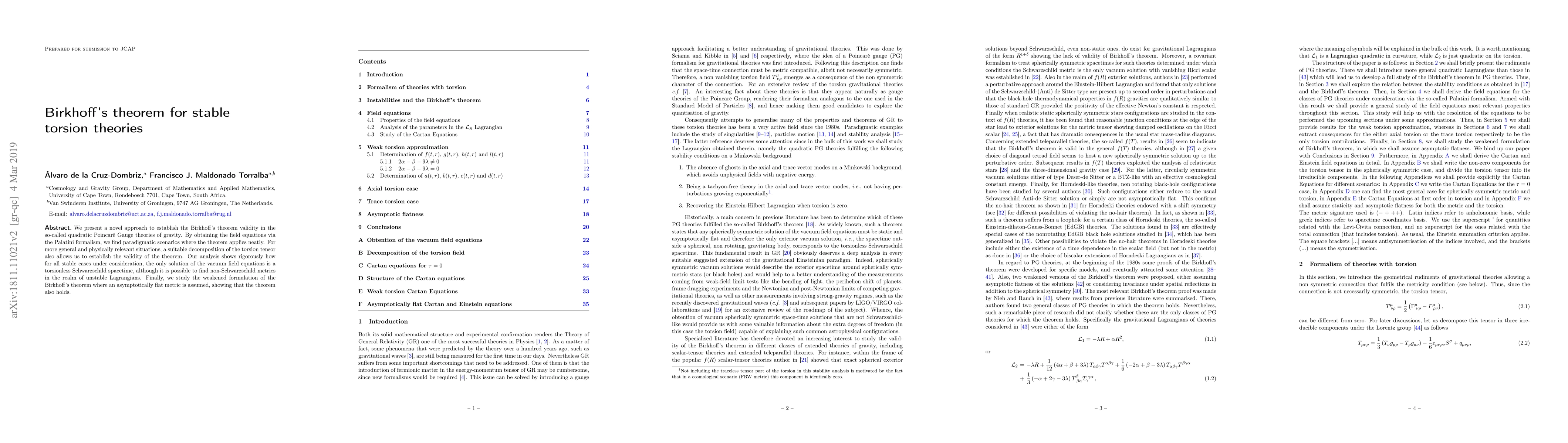 This paper establishes Birkhoff's theorem in quadratic Poincaré Gauge theories using the Palatini formalism and shows that vacuum field equations yield only torsionless Schwarzschild spacetime in stable scenarios. It also confirms the theorem's validity in a weakened formulation for asymptotically flat metrics.