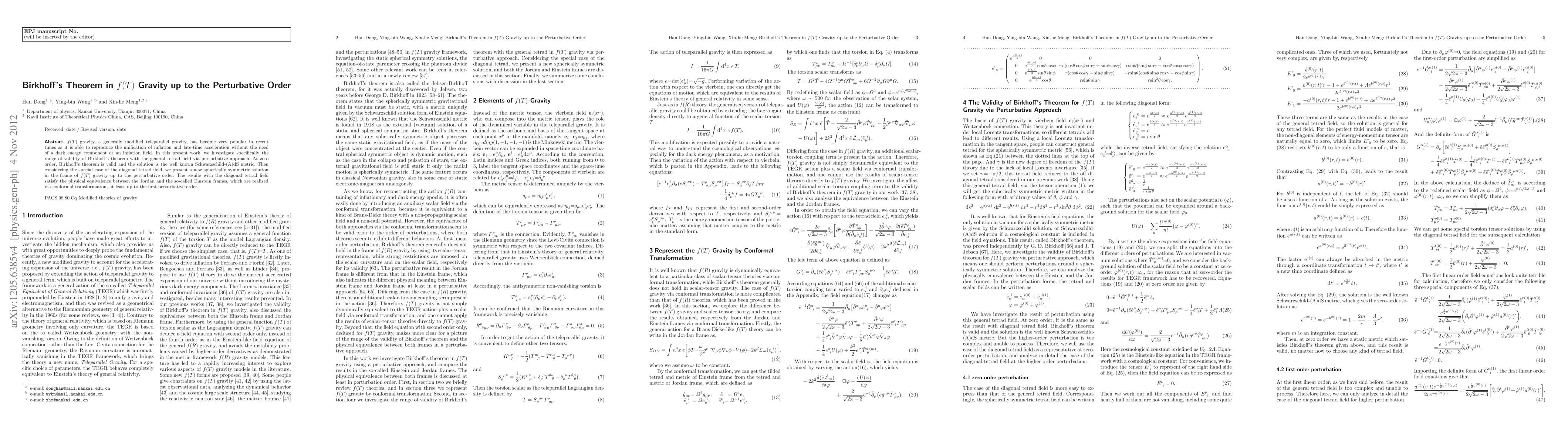 This paper investigates the validity of Birkhoff's theorem in f(T) gravity using a perturbative approach, confirming its zero-order validity with the Schwarzschild-(A)dS metric. It presents a new spherically symmetric solution in this modified gravity framework, demonstrating physical equivalence between Jordan and Einstein frames up to the first perturbative order.